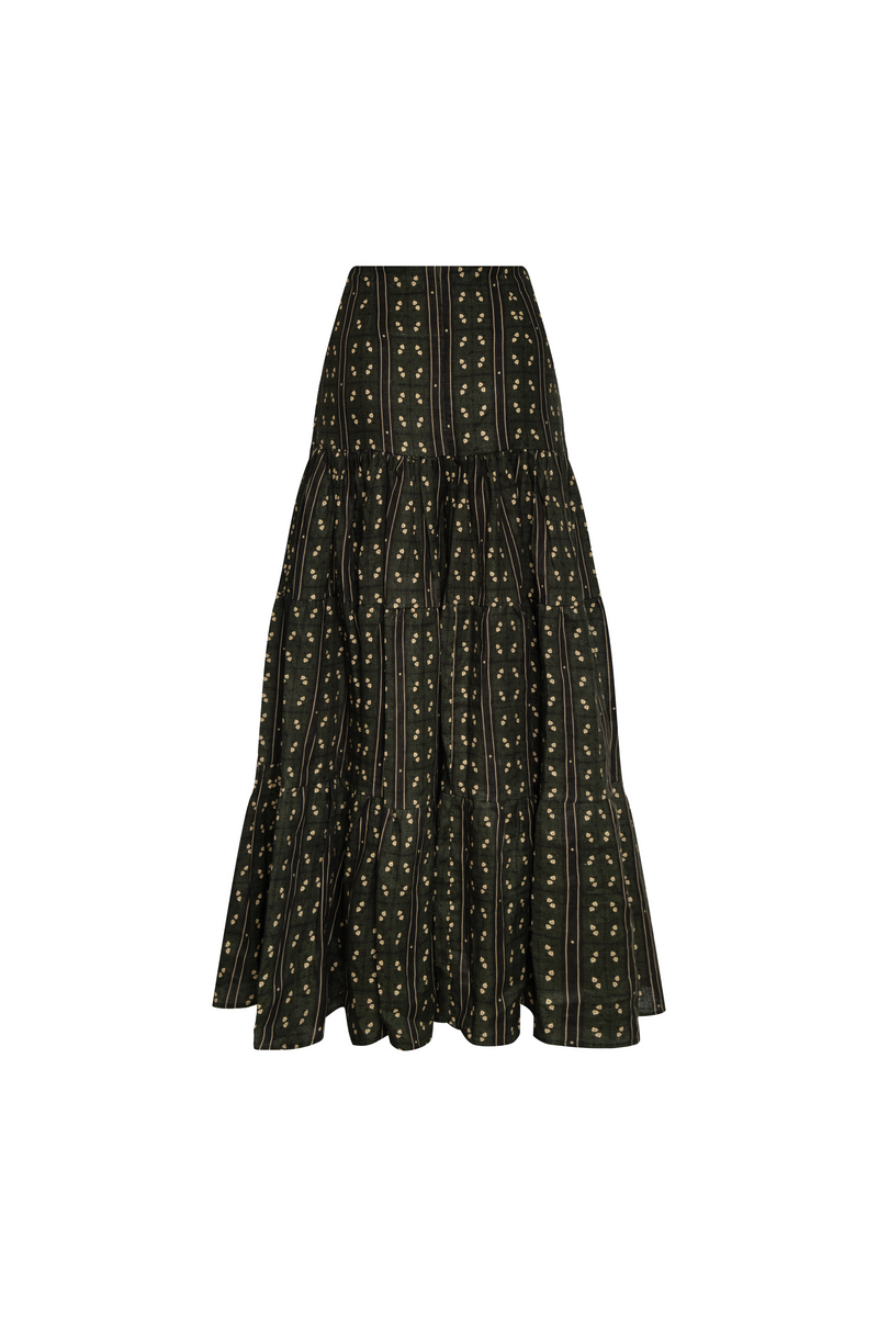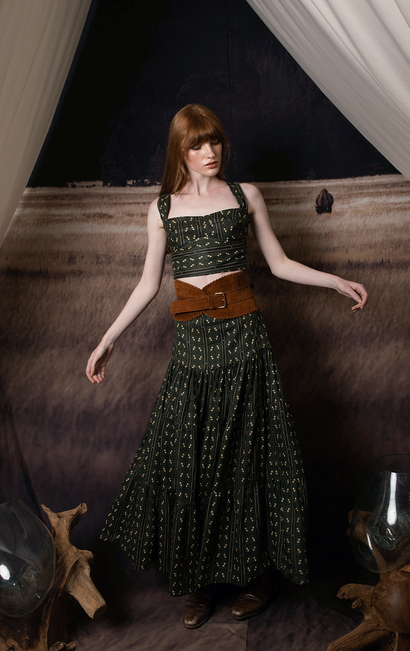 La falda maxi Tala es una prenda atemporal que combina feminidad con encanto campestre. Con una silueta suave y fluida y delicados estampados de mini margaritas sobre sutiles rayas verticales, aporta una elegancia natural a tu armario. Su confección en paneles y detalles fruncidos crean un movimiento elegante, haciéndola perfecta para el día a día con un toque romántico.