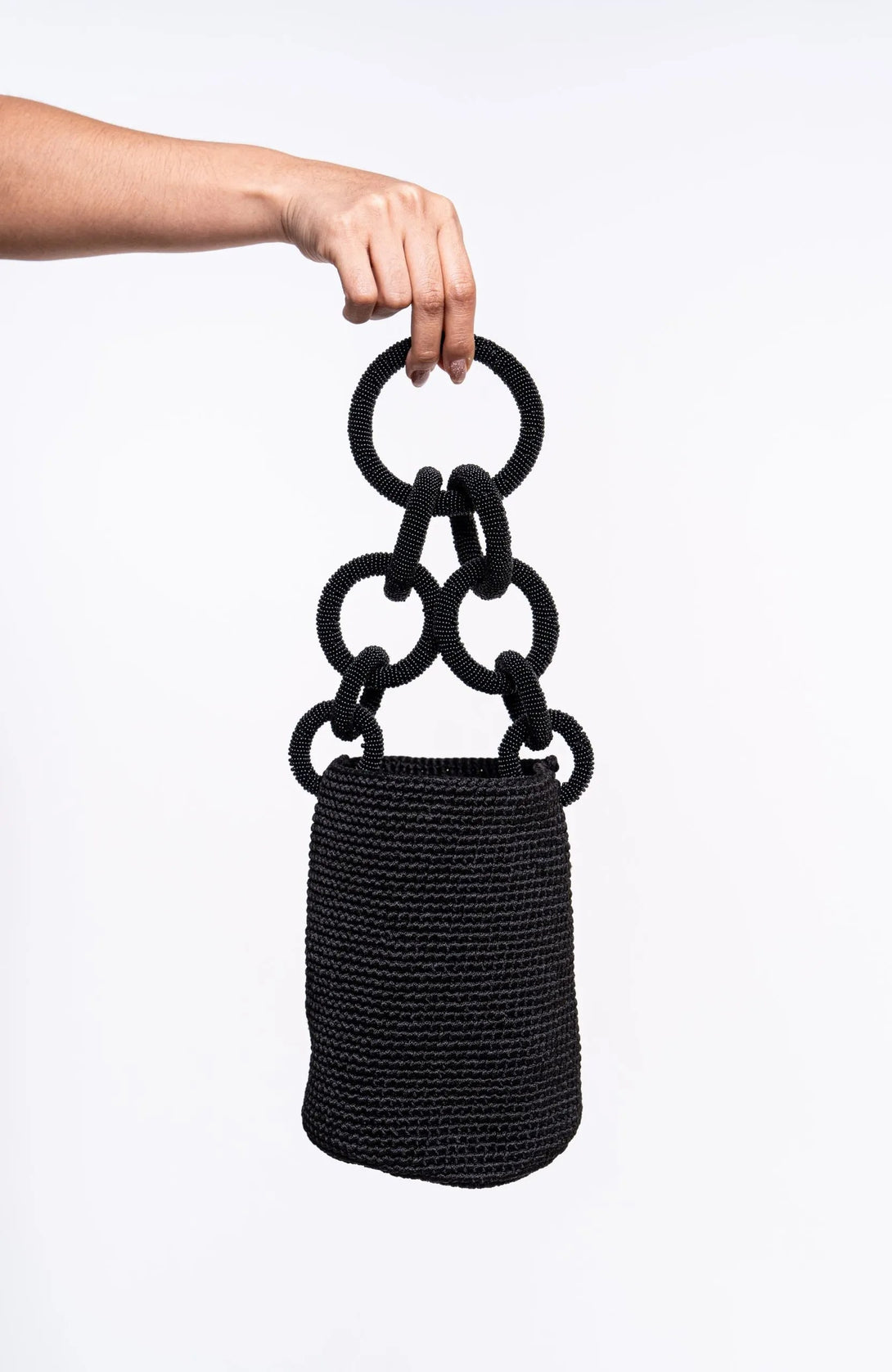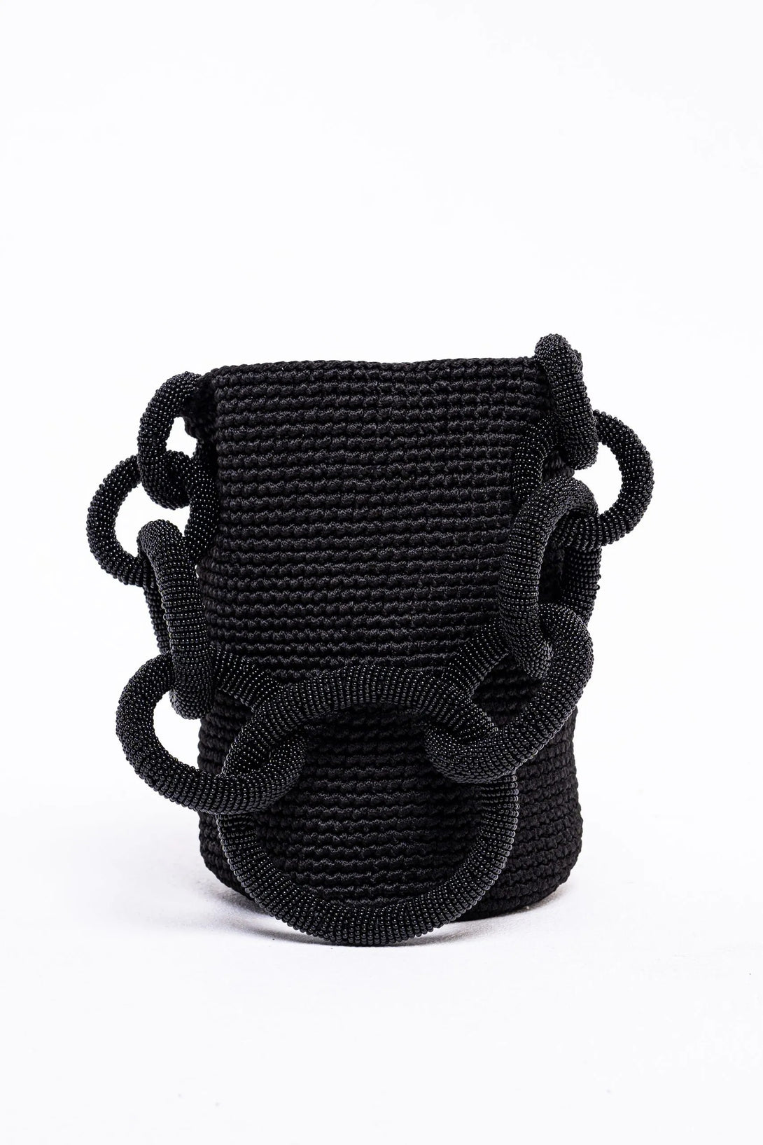 Mochila tejida en hilo de seda, aros bordados con cuentas.
