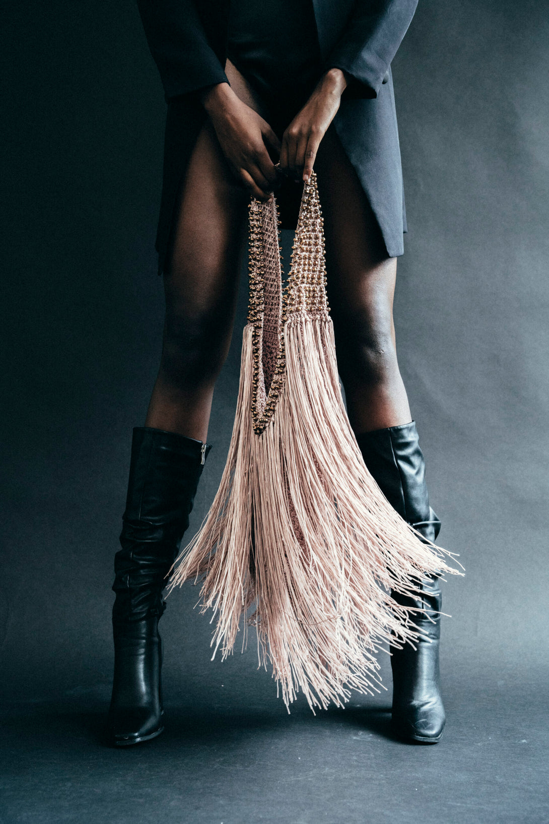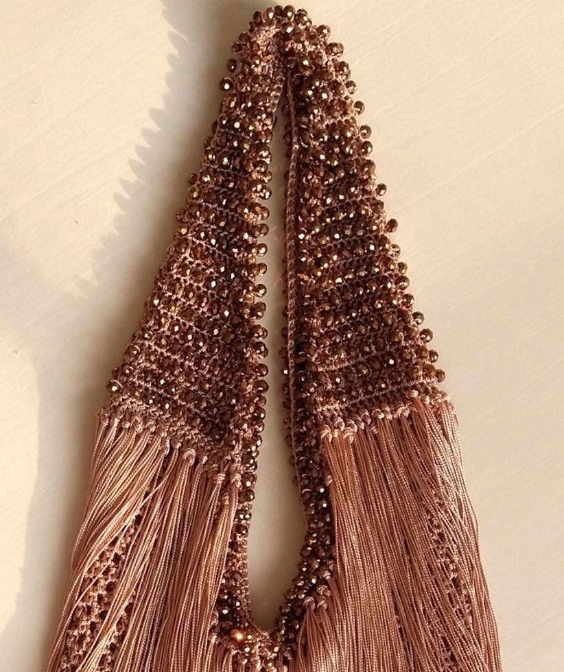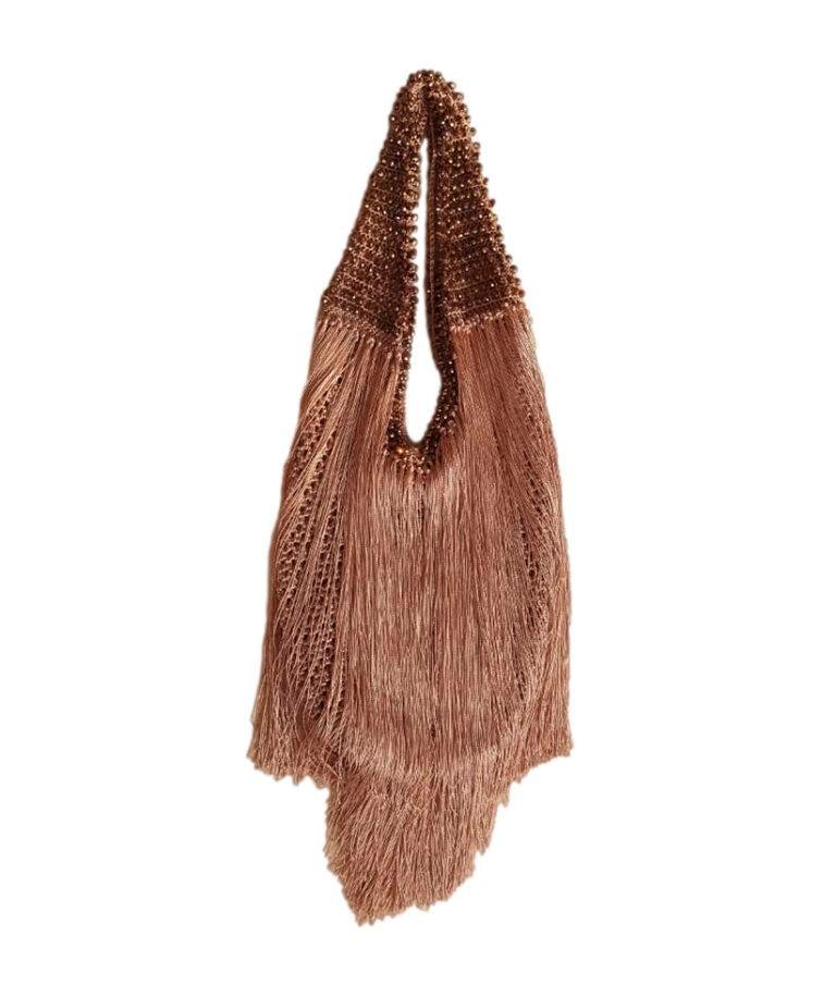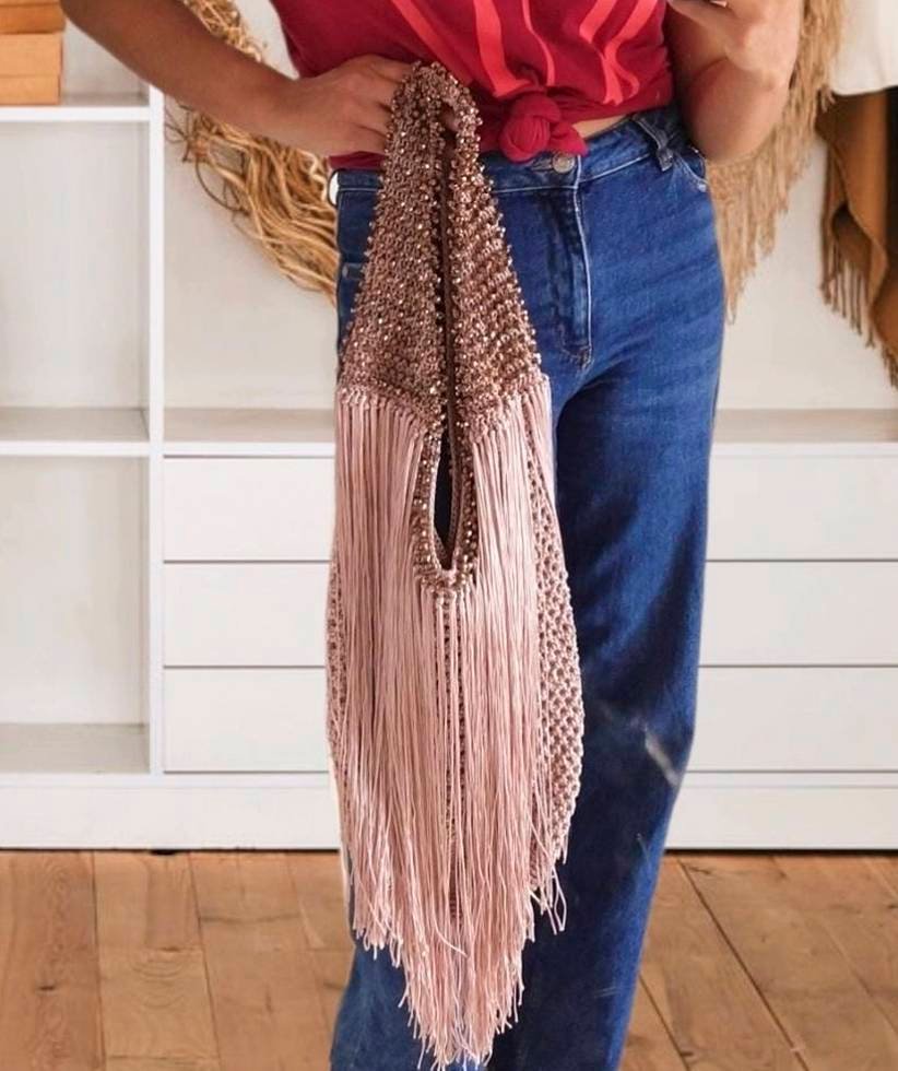 Cartera de hombro estilo mochila, tejida en técnica de crochet, con hilos satinados color palo de rosa. Recamada con cristales tejidos a mano y flecos decorativos. Un complemento único, que será el protagonista de todos tus outfits.