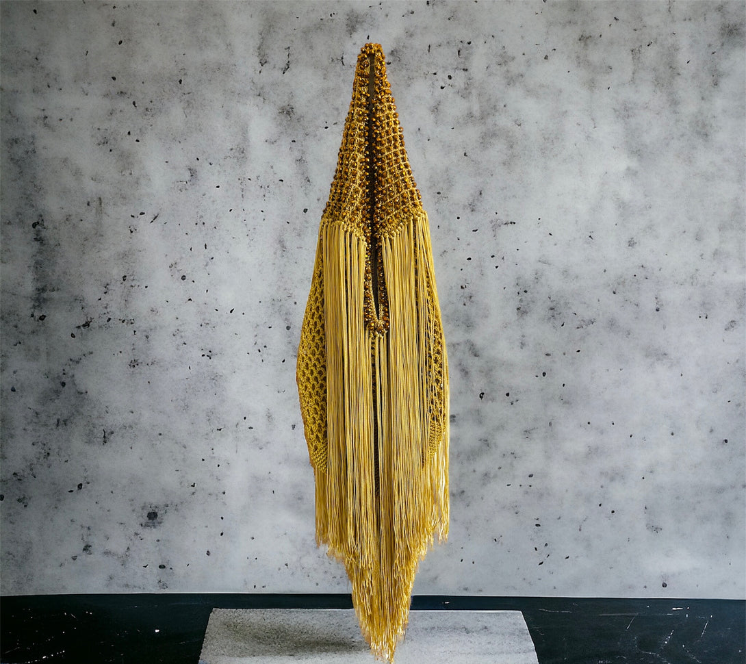 Bolso tejido a mano con fibras textiles. Color: Dorado Arena, bordado con cristales dorados. Medidas: 50x25.