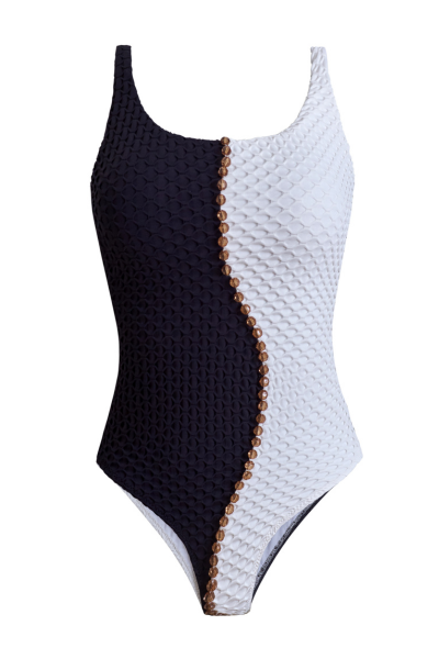 Nuestro enterizo Marble tiene un corte clásico con espalda escotada con recogido. La tela es suave y texturizada e incluye bordado con bolas acrílicas en pieza delantera. Tiene copas removibles.