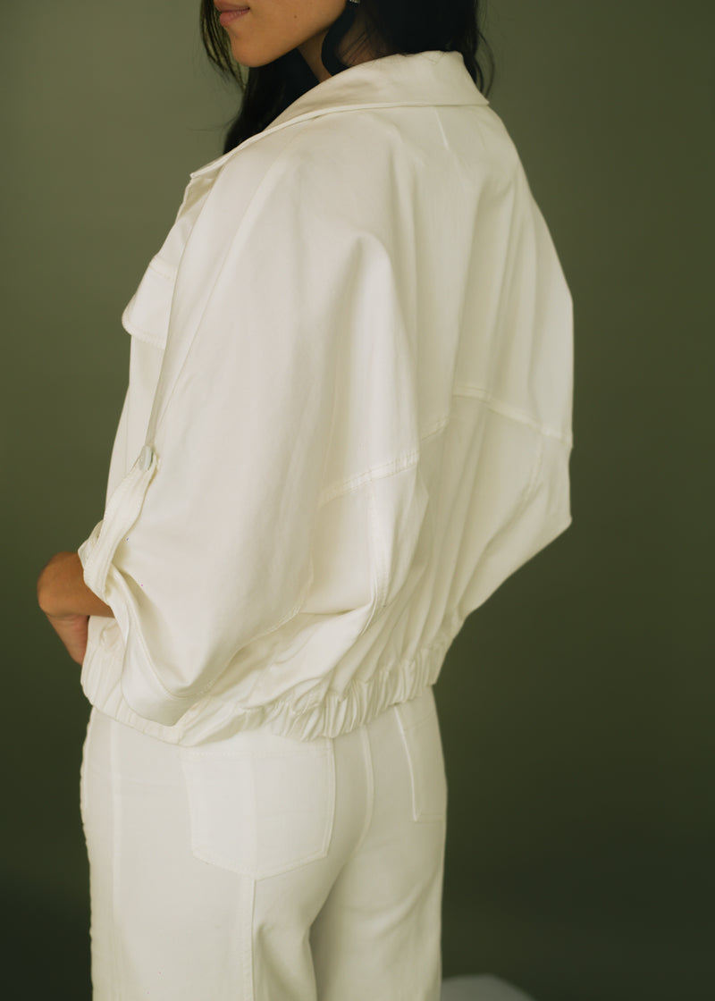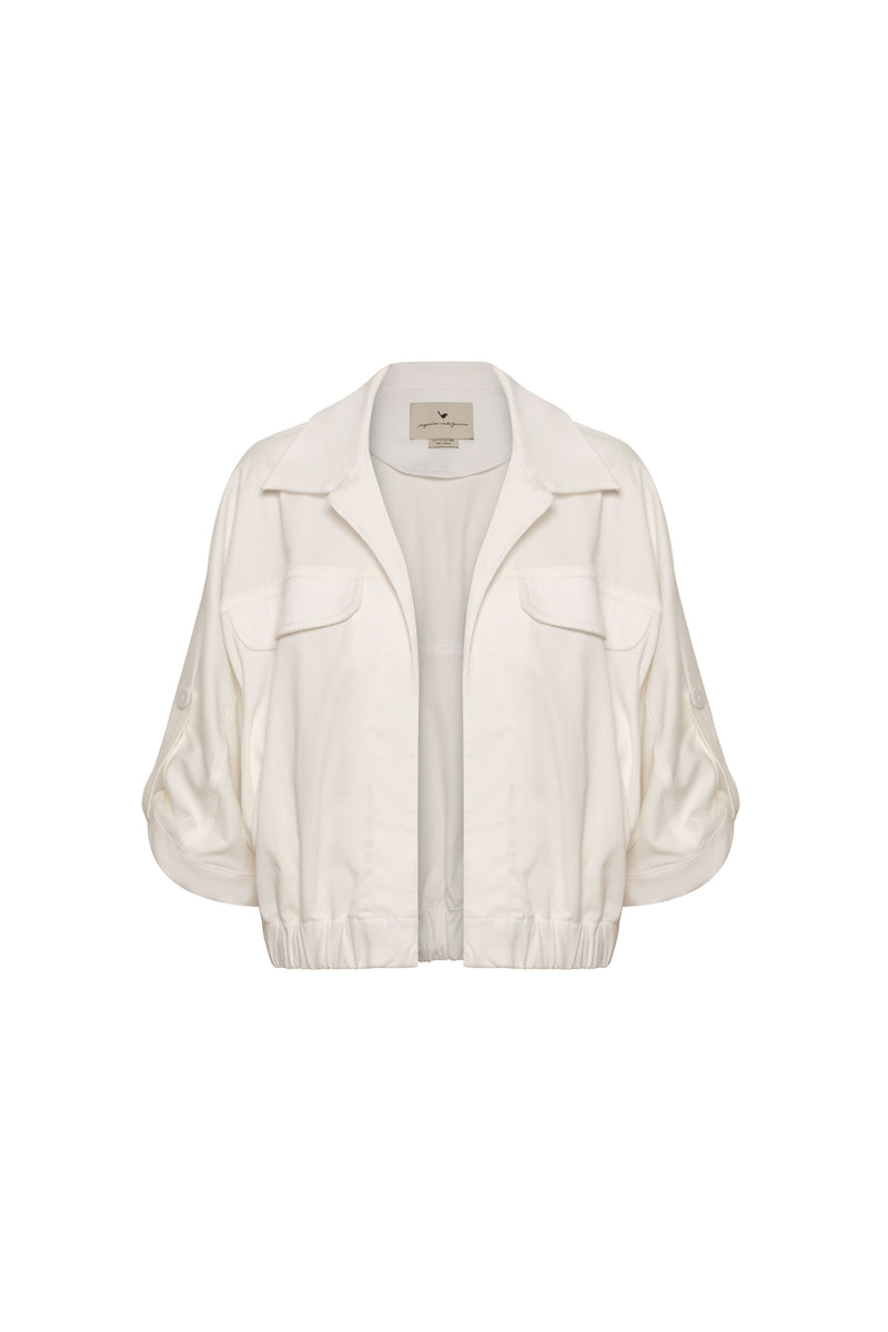 Elegancia atemporal y versatilidad sin esfuerzo. Esta chaqueta ligera, confeccionada en un suave tono marfil, está diseñada para una simplicidad refinada. Su silueta relajada, sus delicados detalles funcionales y su textura sutil la convierten en una prenda esencial de cualquier armario, perfecta para combinar con otras prendas y realzar cualquier look con una sofisticación discreta.