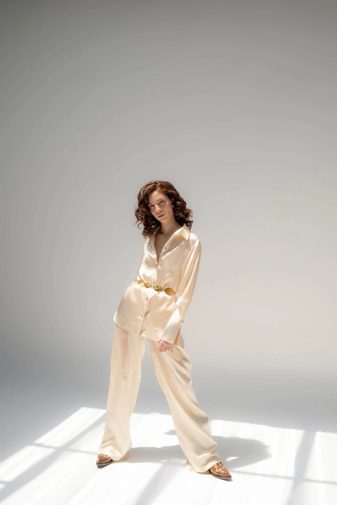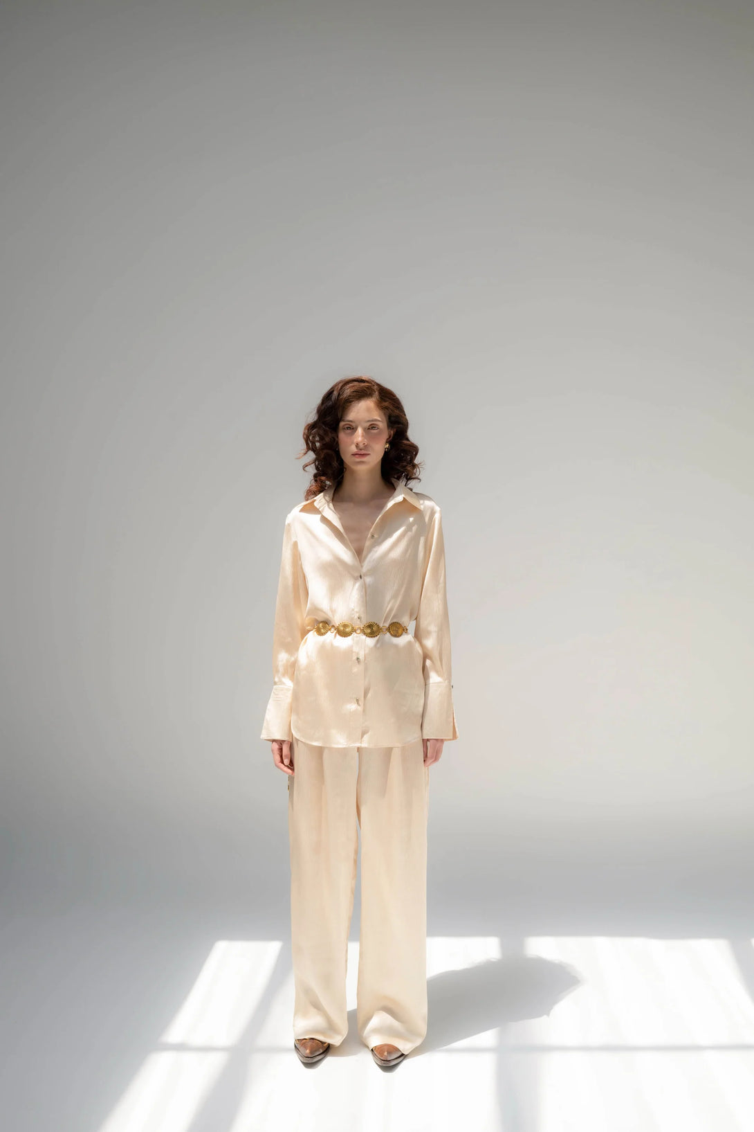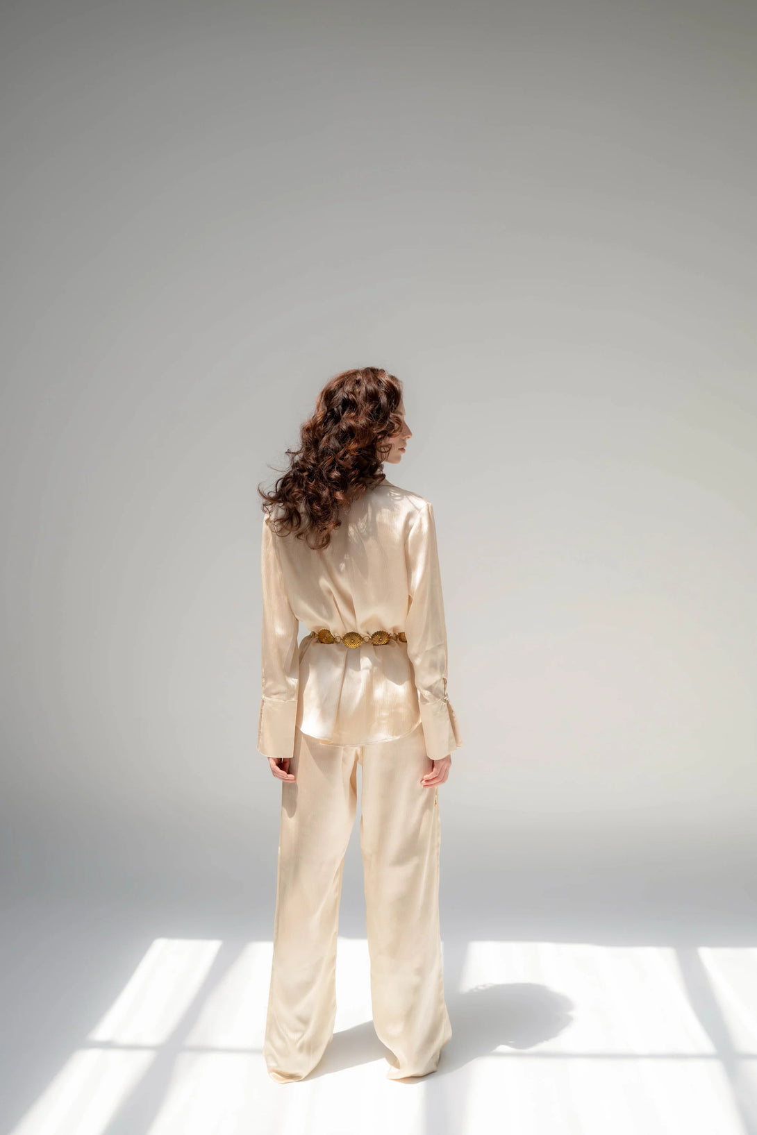 Pantalones anchos con prensa. Pretina con elástico en la parte posterior.