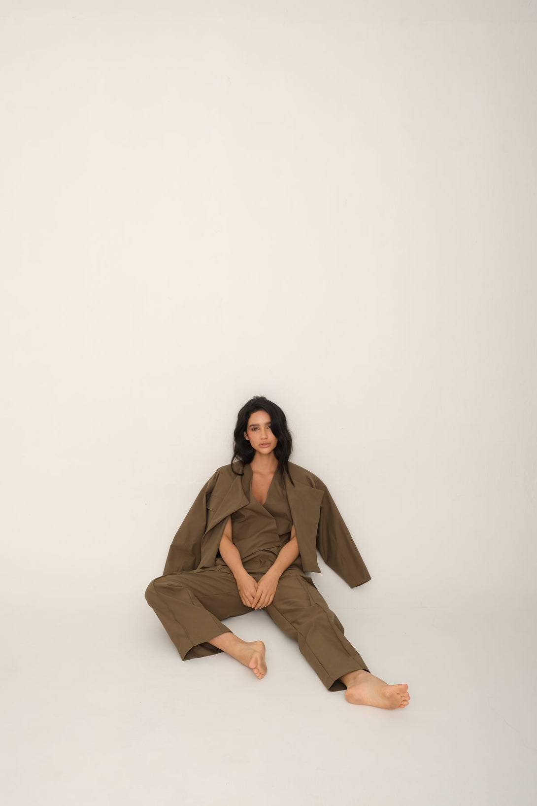 Pantalón de tiro medio. Detalle de pliegue. Bolsillos laterales y media pierna. Pretina lisa. Cierre frontal con cremallera y botón. Hecho en Colombia.