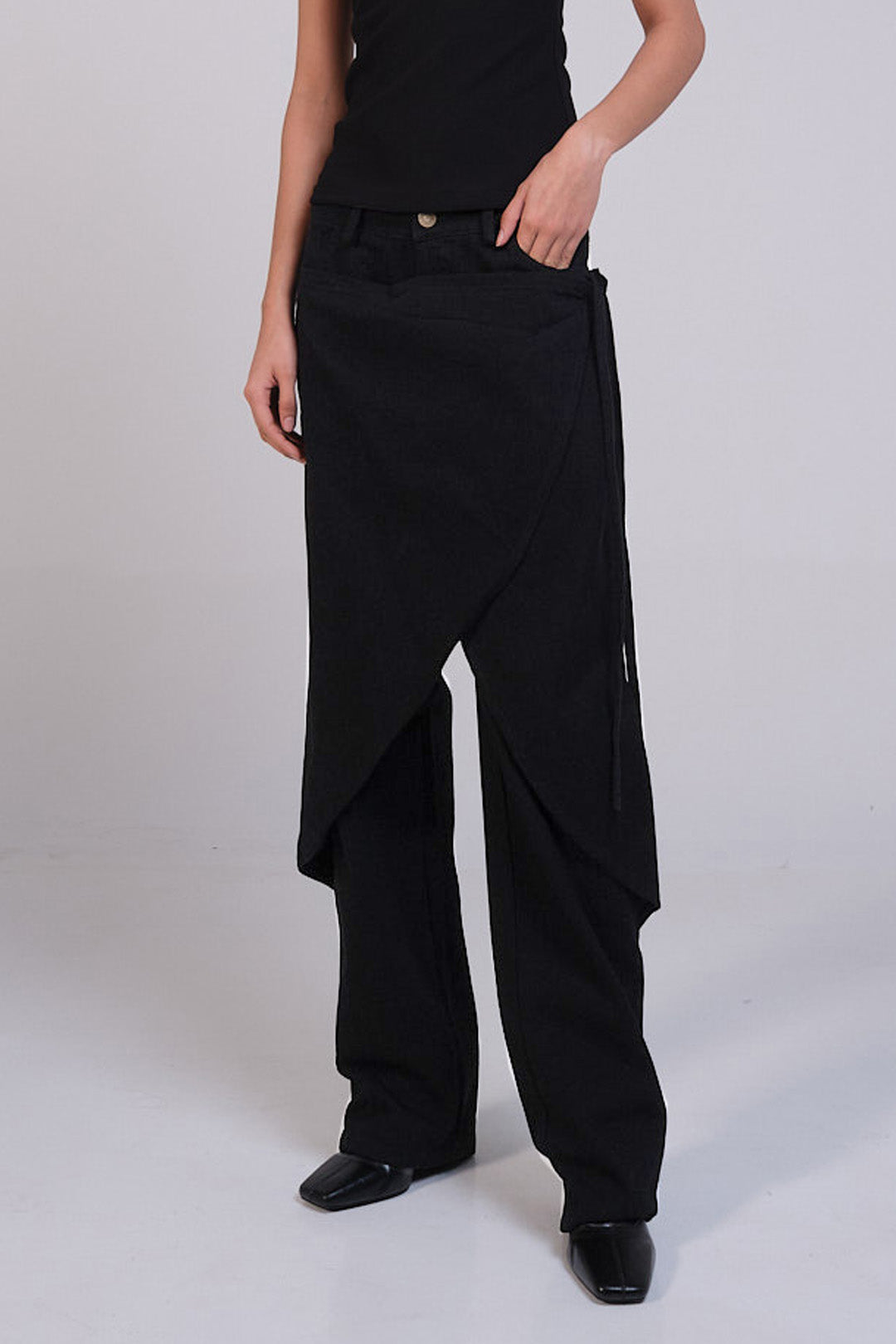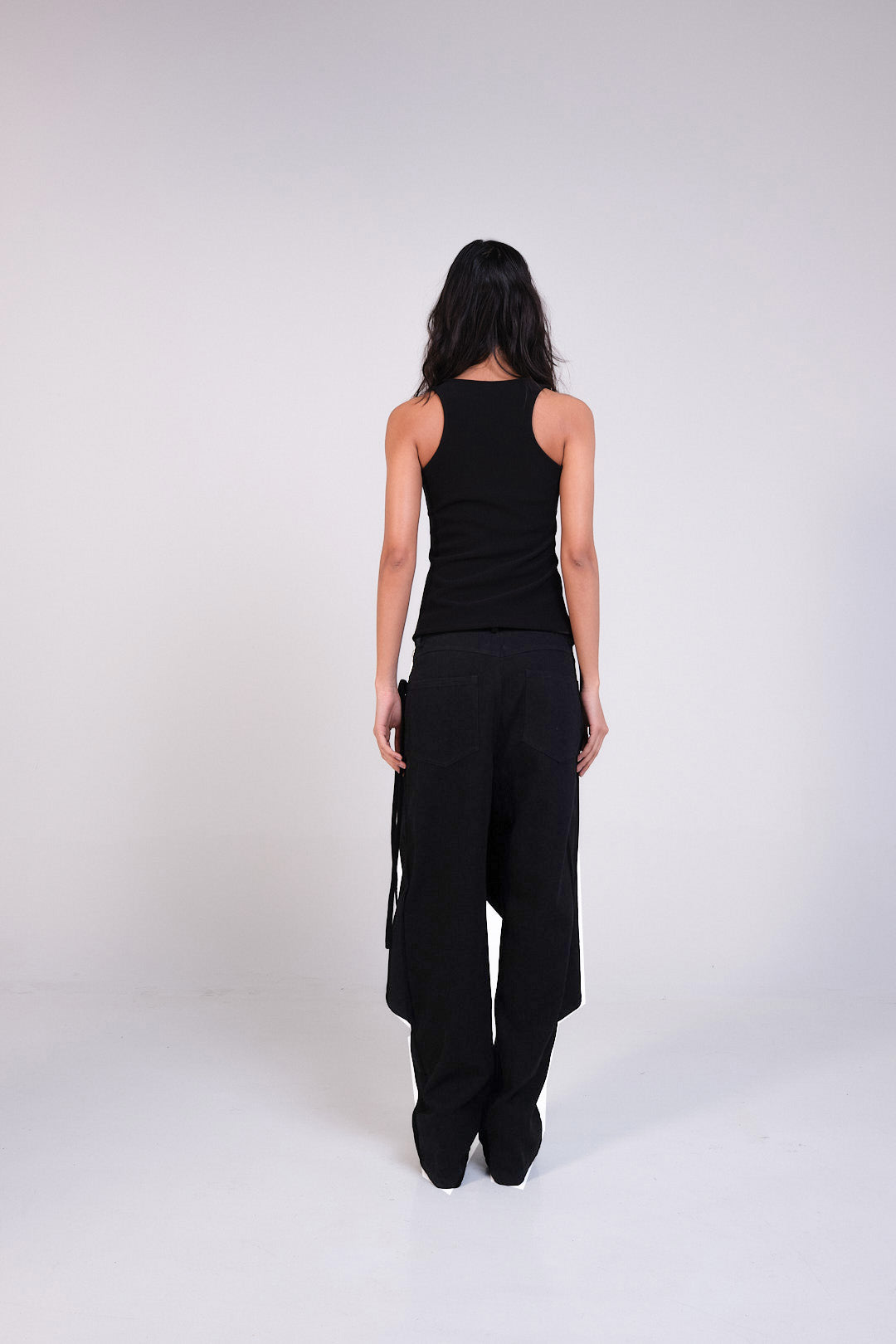 Pantalón de denim negro, con pretina y pasadores y solapas laterales con cuerda para amarrar a cada lado.
