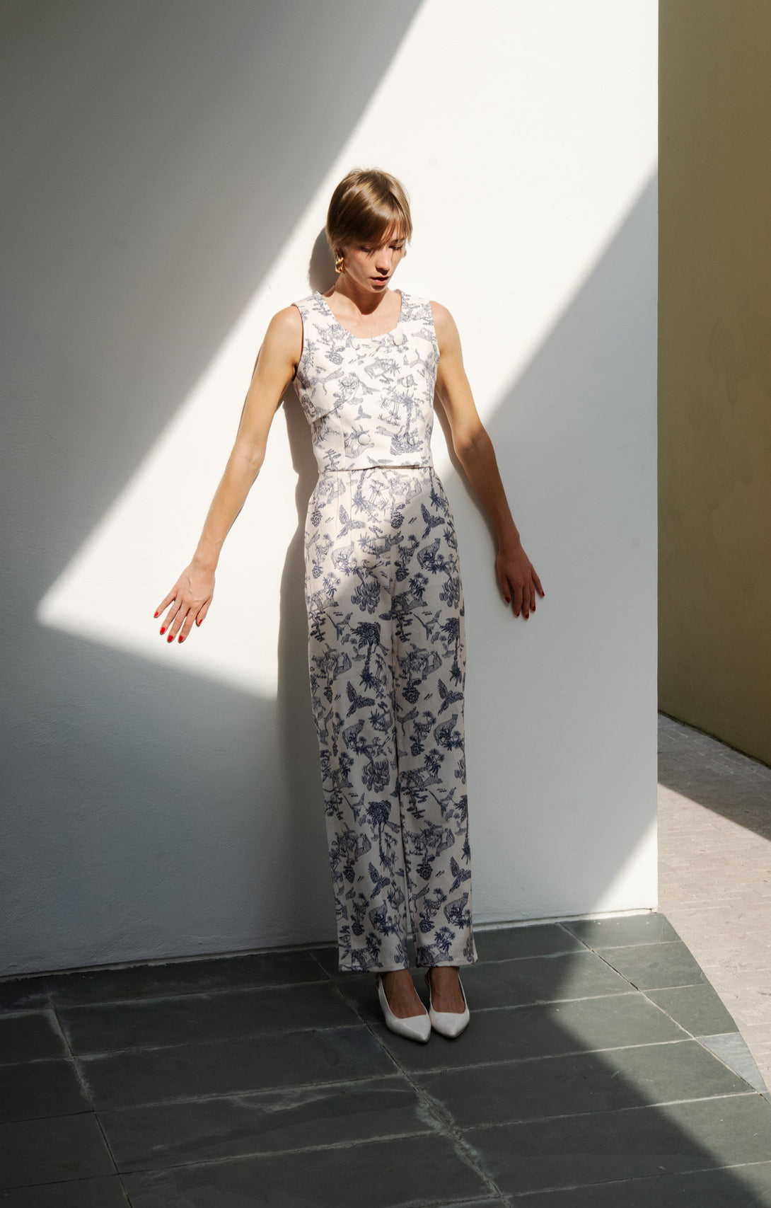 Pantalón recto con detalle de pinzas en la cintura elaborado en una mezcla eco amigable de algodón y lino, respirable y biodegradable. Su estampado toile de jouy con motivo de guepardos y colibríes le da un toque unico y sofisticado. La modelo lleva una talla S y mide 1,75. Esta prenda es hecha en Colombia en condiciones de trabajo éticas.