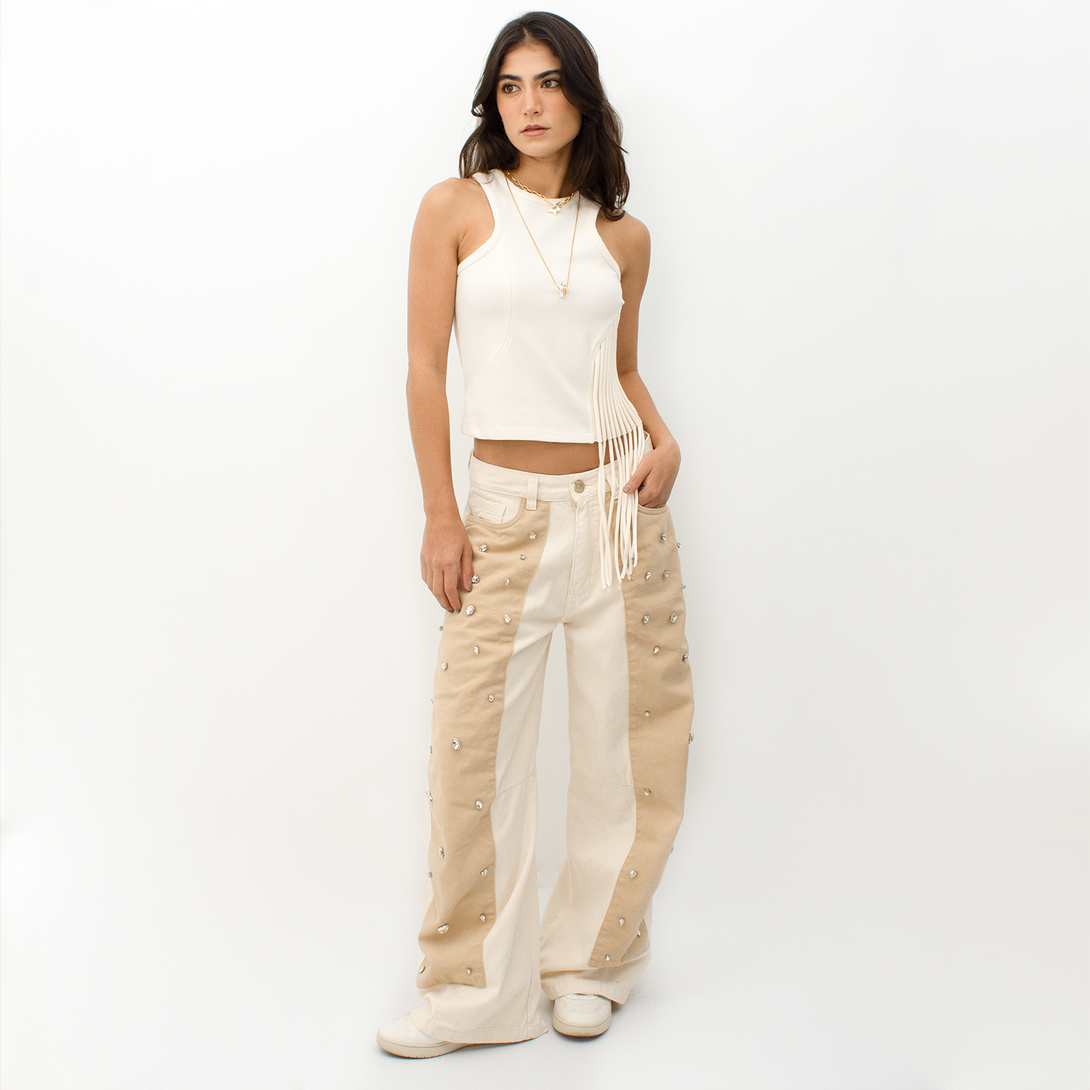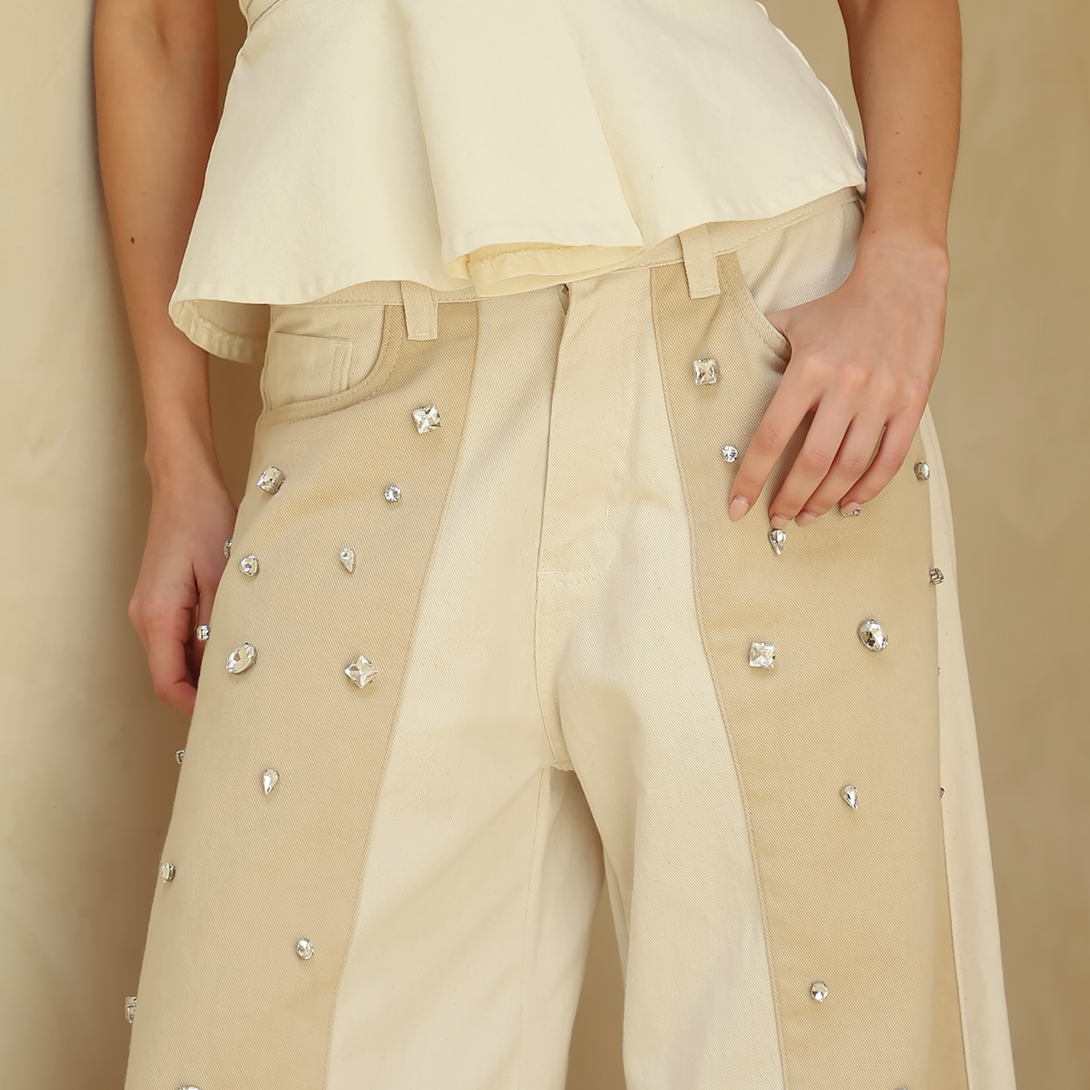 - Pantalón de denim, con silueta de pierna ancha, osturas en contraste Y piedras