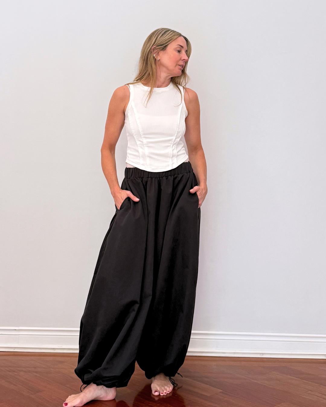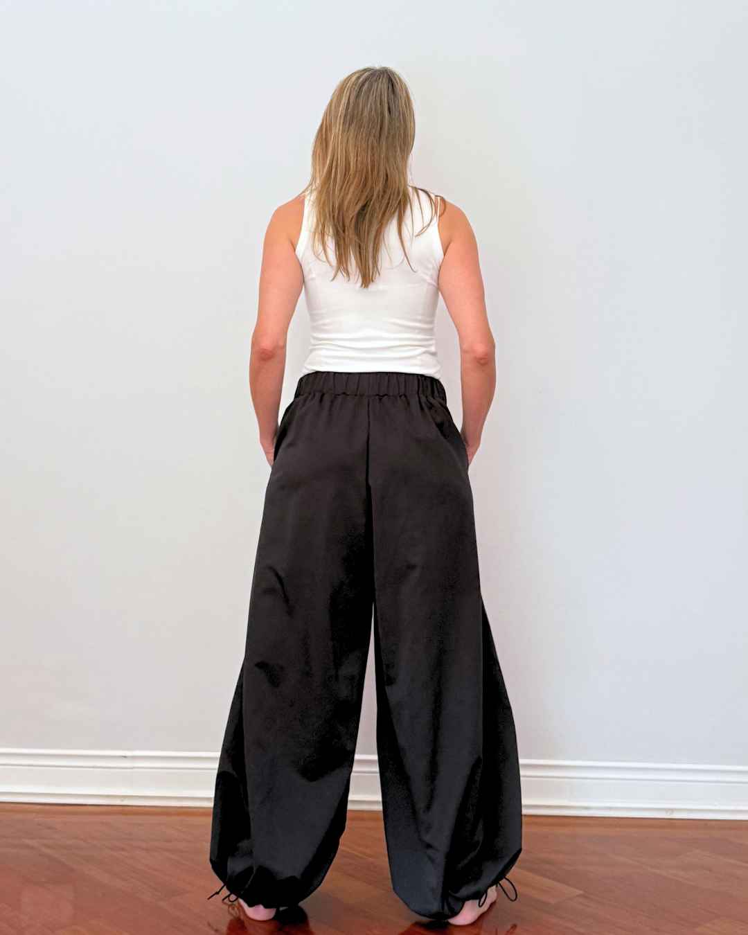 Es un must-have de nuestra nueva coleccion. Es una silueta amplia en una tela fresca y comfortable, elevando la silueta jogger a una pieza mas sofisticada. Tiene un detalle de costuras en la parte lateral de las piernas con elastico en la cintura. Esta prenda puede ser llevada de manera informal con una tshirt y unos tenis o con unas botas y blazer para elevar su look. La modelo lleva una talla S.
