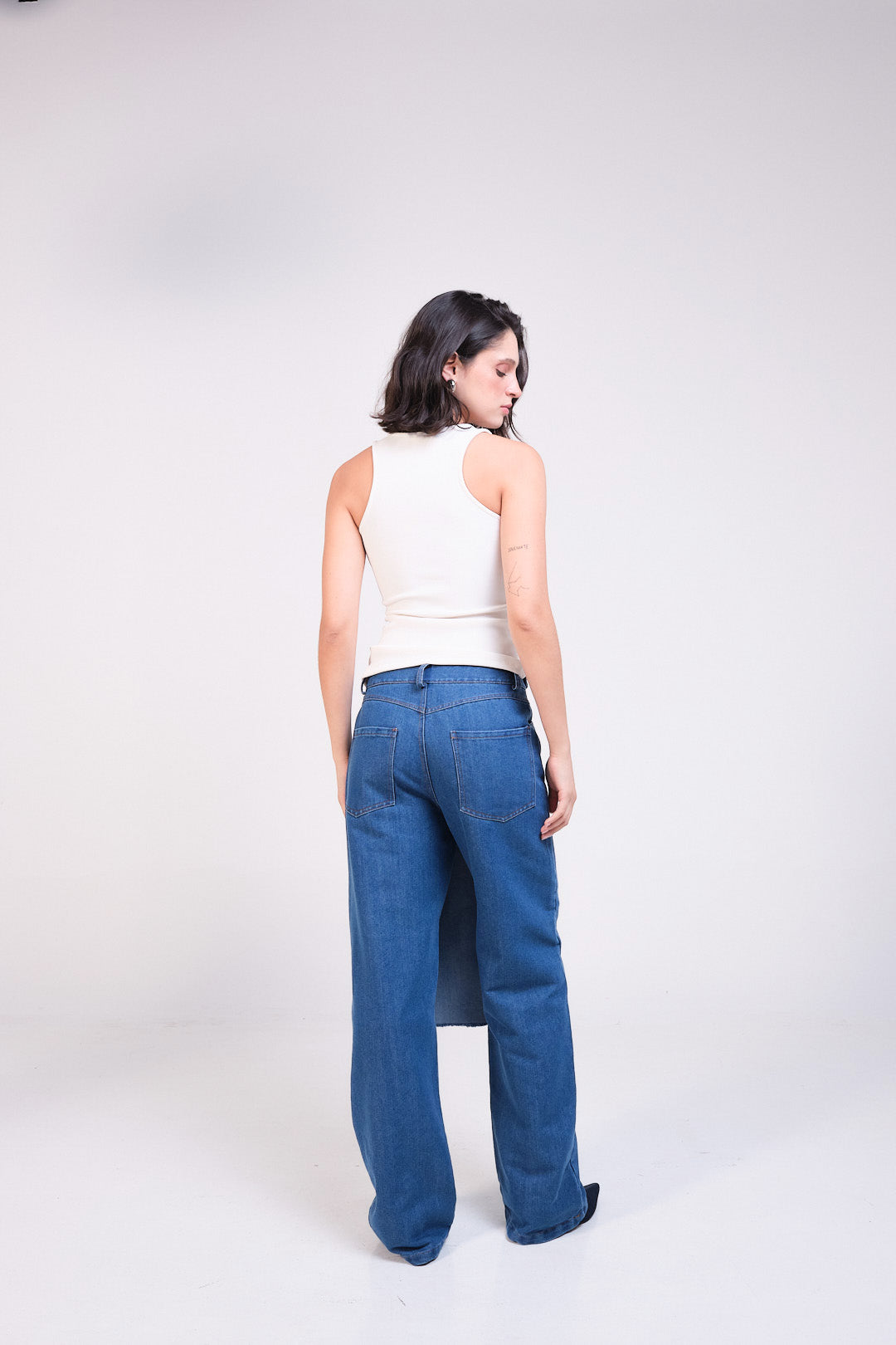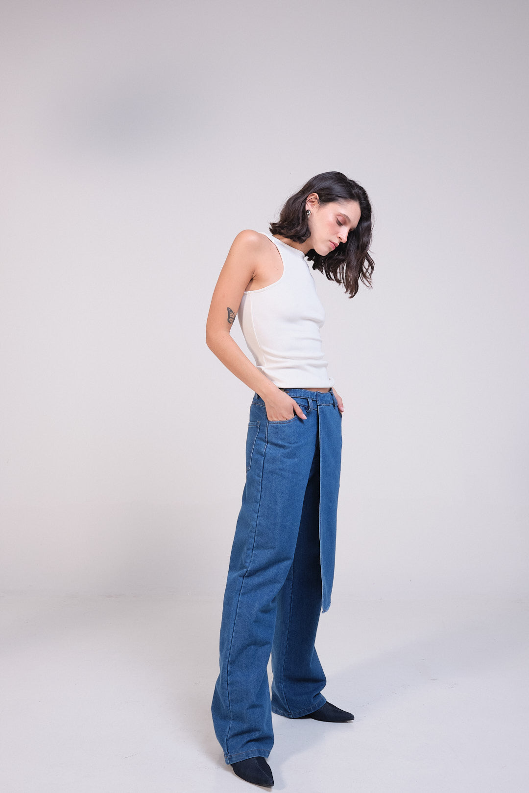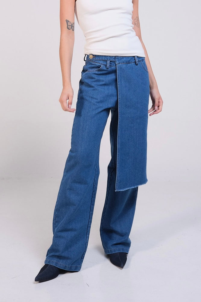 Pantalón de denim con solapa frontal lateral, con pretina y pasadores, sistema de cierre frontal con cremallera y botón, bolsillos delanteros y de parche en la parte posterior del pantalón.