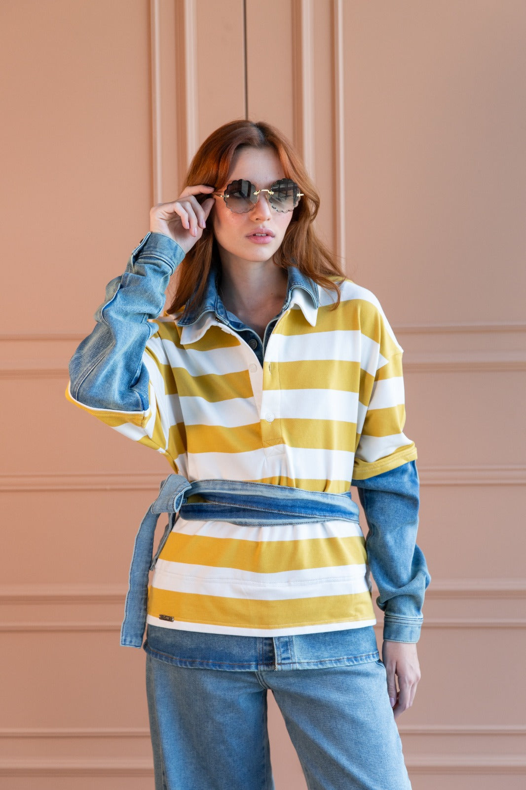 Camisa tipo polo confeccionada en tejido de punto con un diseño de rayas bicolor con detalles en denim liviano en cuello y mangas