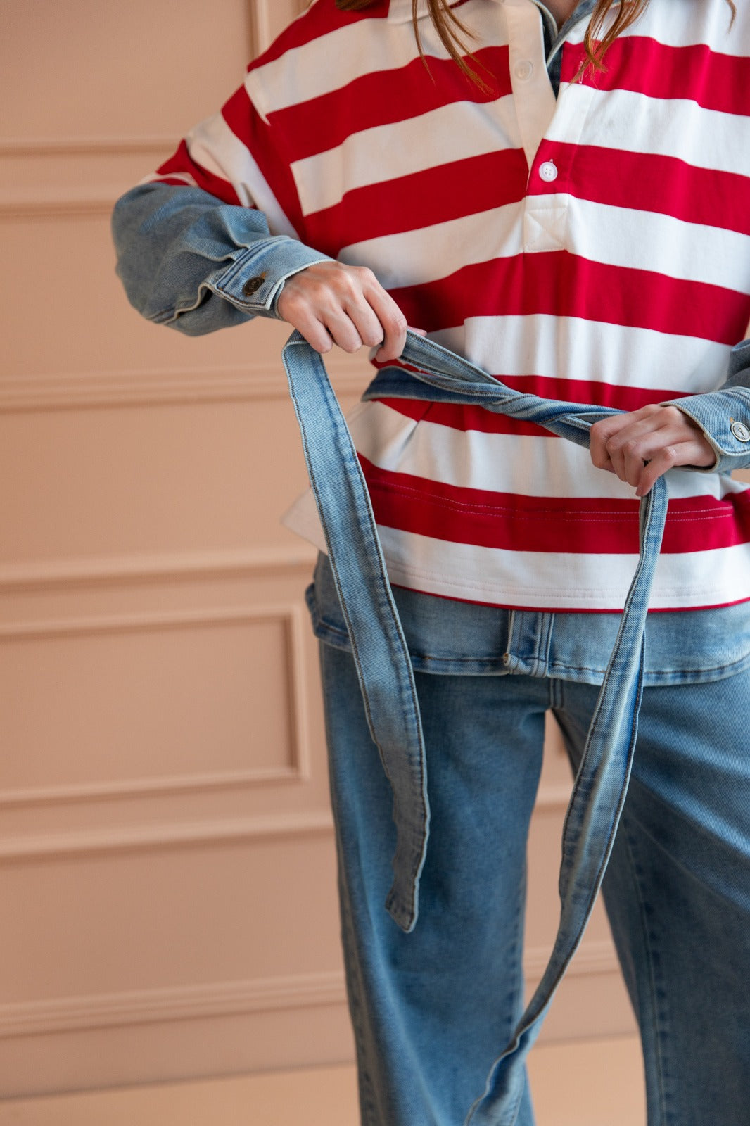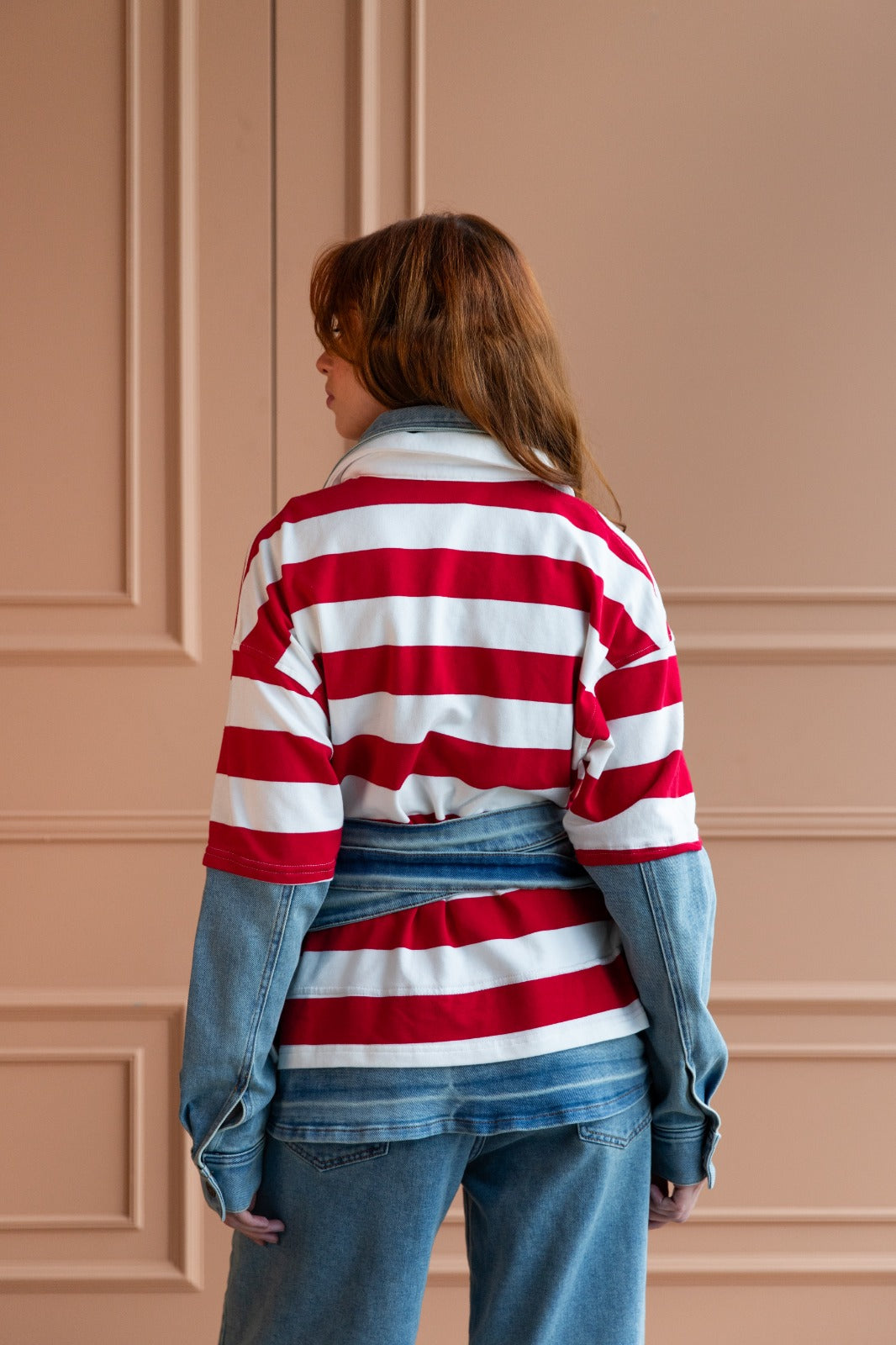 Camisa tipo polo confeccionada en tejido de punto con un diseño de rayas bicolor con detalles en denim liviano en cuello y mangas