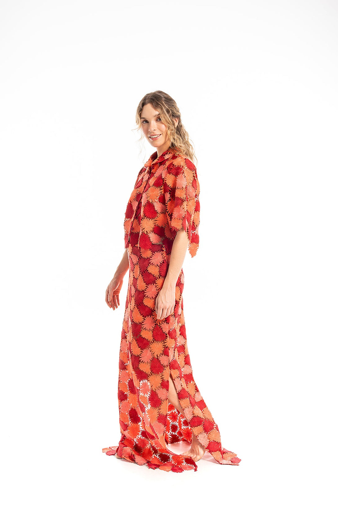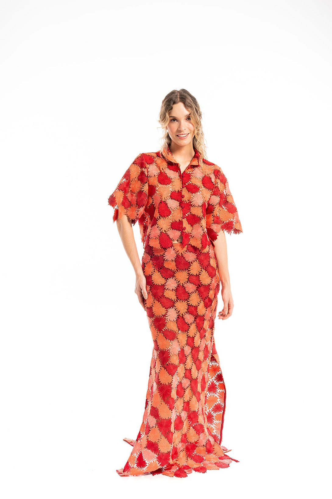 Nuestra camisa Azalea es una camisa corta con mangas sueltas y cortas. Tiene cuello camisero redondo y botones forrados. La tela es un texturizado floral.