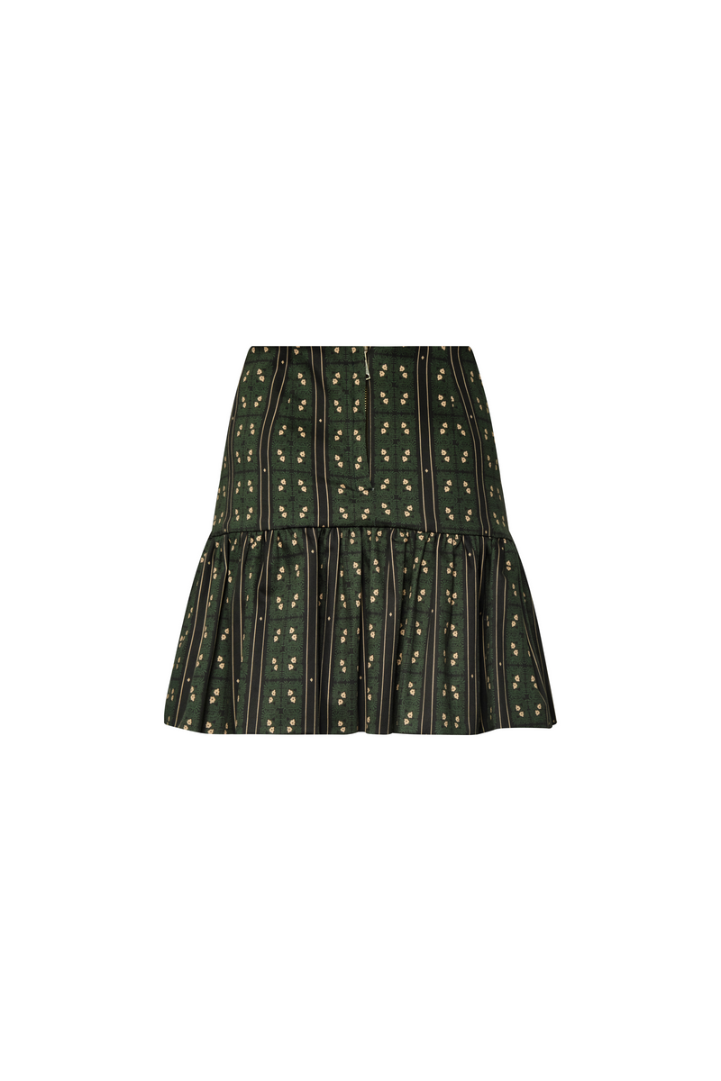 Una prenda llamativa con un encanto divertido. La minifalda Ada presenta un favorecedor corte de cintura alta y un bajo ligeramente fruncido que aporta movimiento y volumen a tu look. Su base verde intenso, adornada con delicados motivos florales y sutiles rayas, la hace atemporal y versátil, perfecta tanto para ocasiones formales como informales.