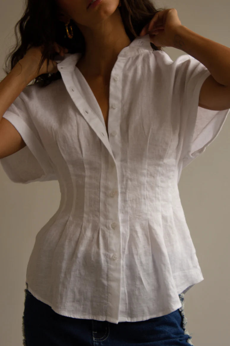 El Top Akito es nuestra versión más fresca y femenina de las camisas Insignia clásicas. Con un ajuste sutil en la cintura y cuello de camisa, logra el equilibrio entre estructura y fluidez. Los detalles que la hacen un tesoro de esta colección: los botones en forma de flor, las pinzas que entallan sutilmente, y nuestro logo ID. bordado en el cuello. Es especial y fácil de llevar.