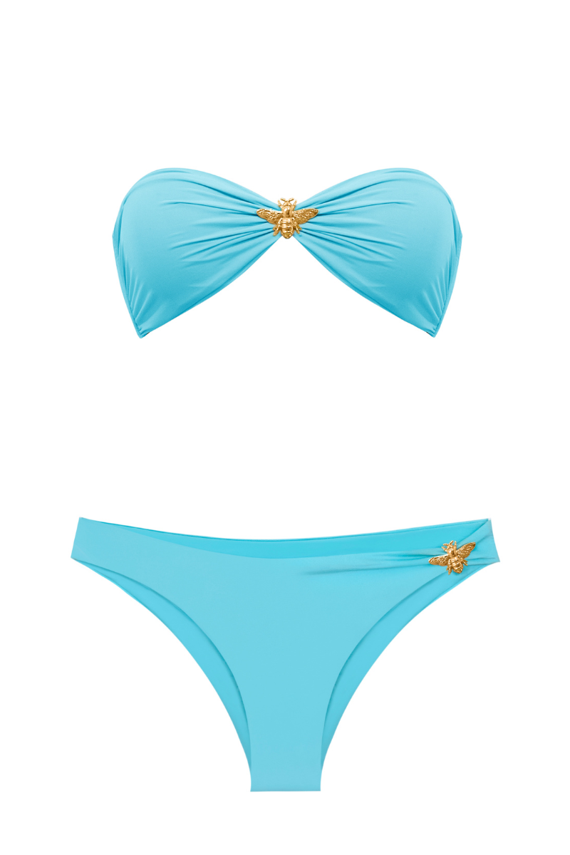 Nuestro top Carmen es un top tipo bandeau con accesorio con baño de oro en centro. Se amarra en posterior. Composición de la tela: 78% Poliamida 22% Elastano. Todas nuestras piezas se venden por separado, top y bottom/panty
