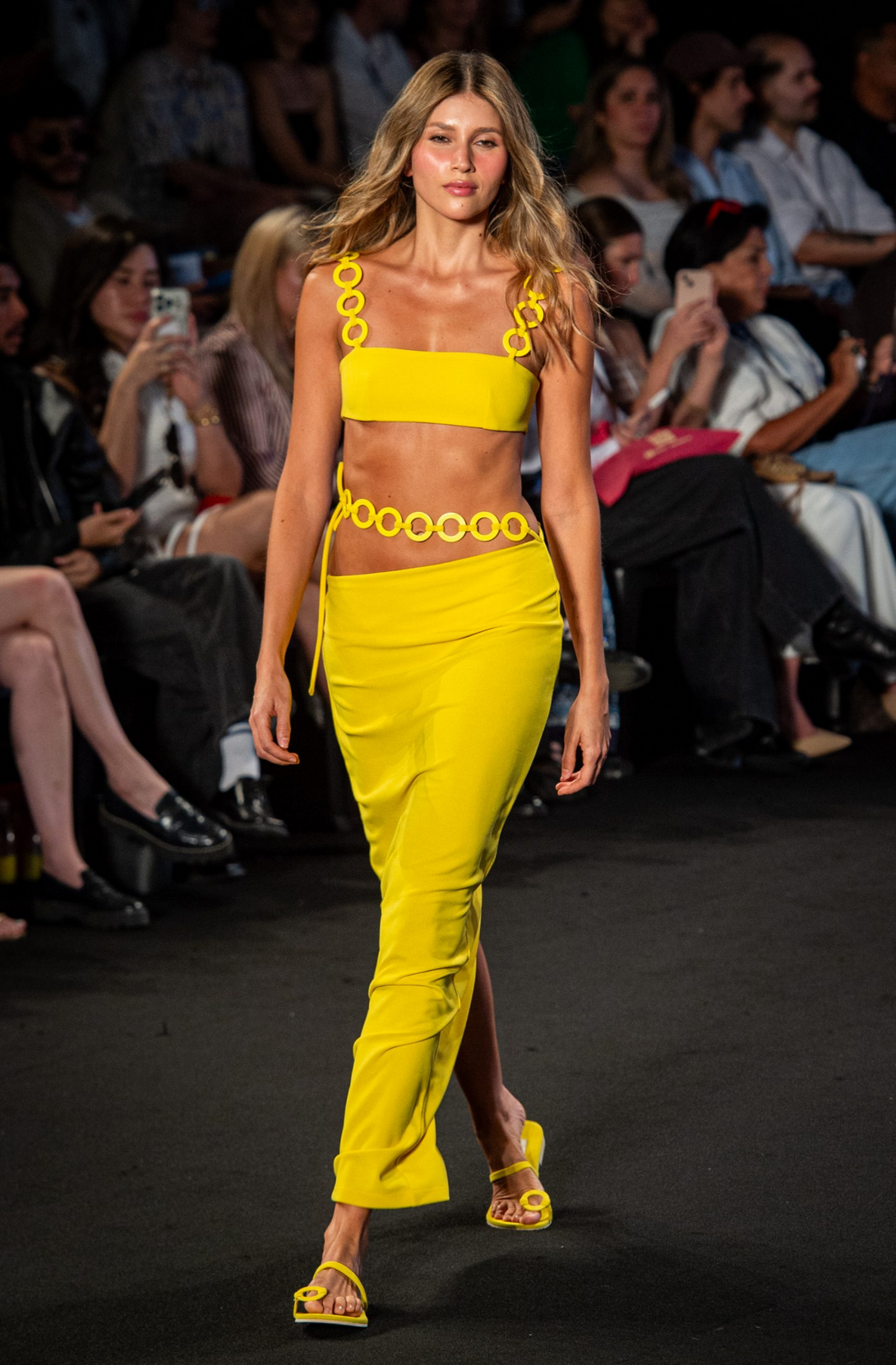 Nuestro conjunto amarillo tiene un top bandeau con detalles de aros en los tirantes.