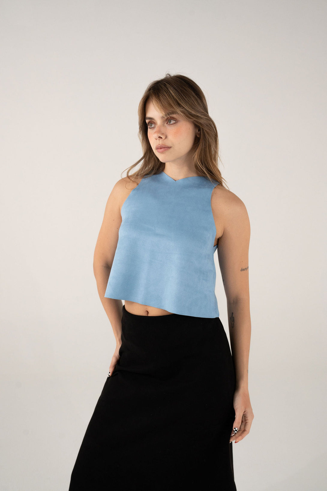 El Top Cleo es una de nuestras prendas más icónicas y versátiles. Su diseño crop holgado, cuello alto y caída estructurada pero fluida lo convierten en un esencial atemporal que se adapta a todo tipo de ocasión: desde un día casual hasta un evento especial.