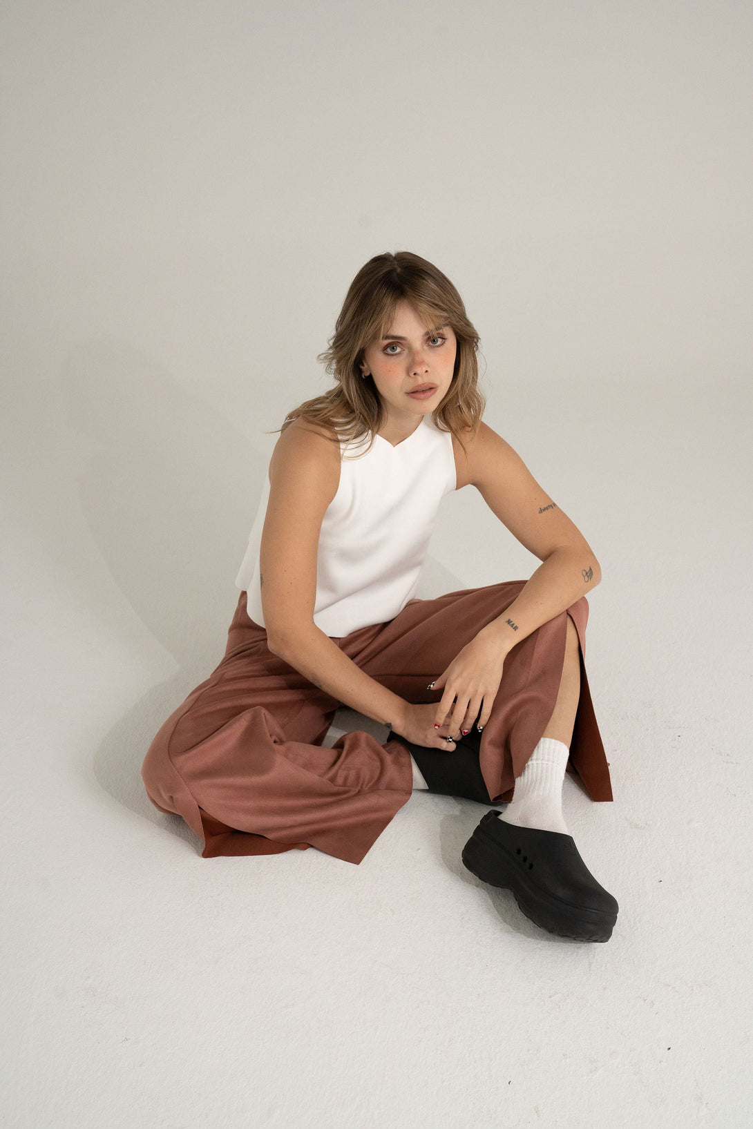 Nuestro top más icónico. El Top Cleo tiene una silueta holgada tipo crop que se ajusta suavemente a los hombros y realza la figura gracias a su cuello alto. La tela estructurada con caída fluida da un toque moderno y elegante sin esfuerzo.