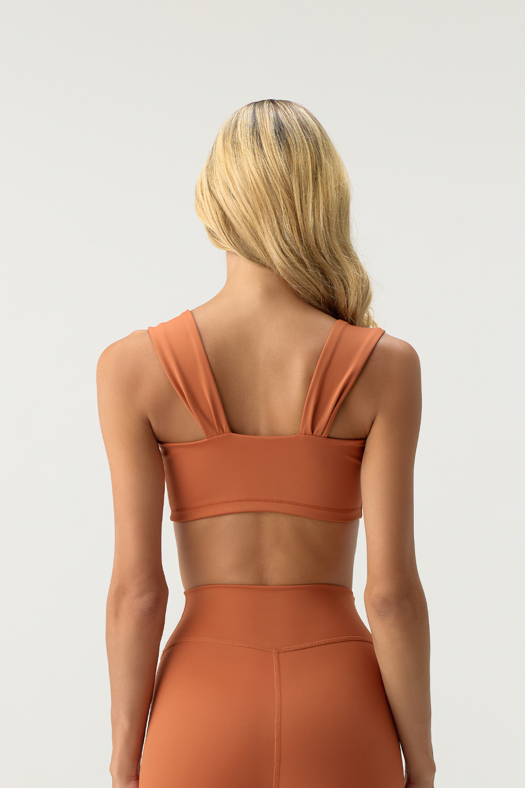 Un diseño minimalista con un detalle diferencial. Este top deportivo en tono terracota destaca por su escote cuadrado y tirantes con frunce, que aportan textura y un acabado técnico distintivo. Con compresión media y tejido elástico de secado rápido, brinda soporte y comodidad durante entrenamientos de bajo y mediano impacto, además de ser ideal para looks athleisure con inspiración marroquí.