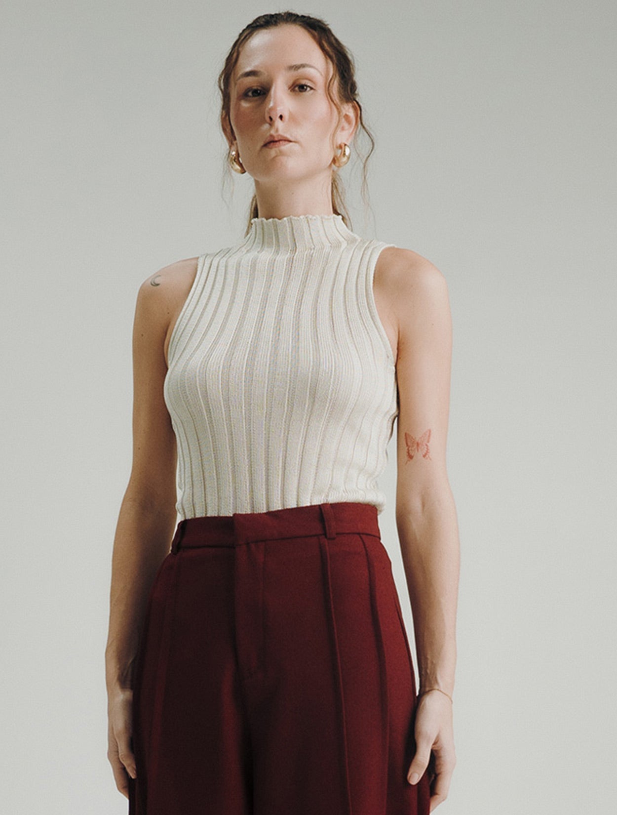 Top esqueleto tejido en hilo de seda con puntada tipo rib. Diseño de cuello alto con terminaciones arandeleadas en cuello y ruedo. Largo hasta debajo de la cintura.