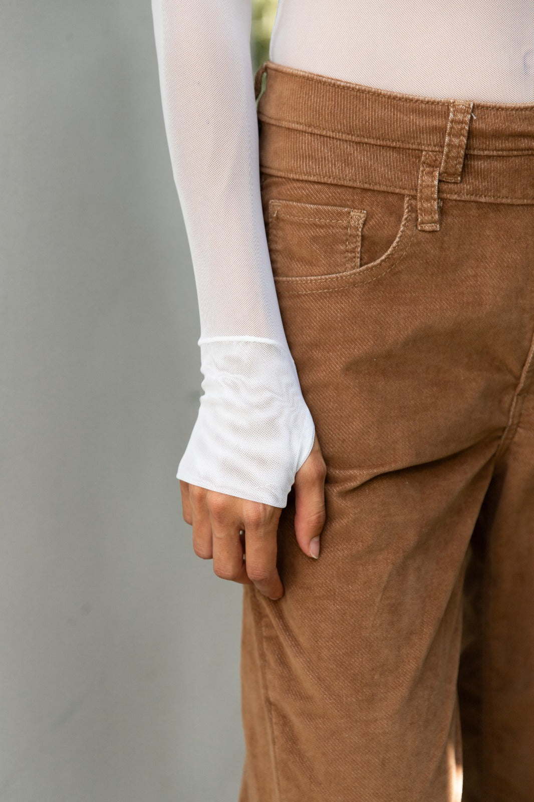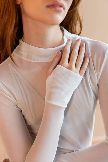 Top de manga larga en mesh elástico con cuello tortuga.,tiene aberturas para los pulgares y un fit ceñido ideal para usar solo o en capas