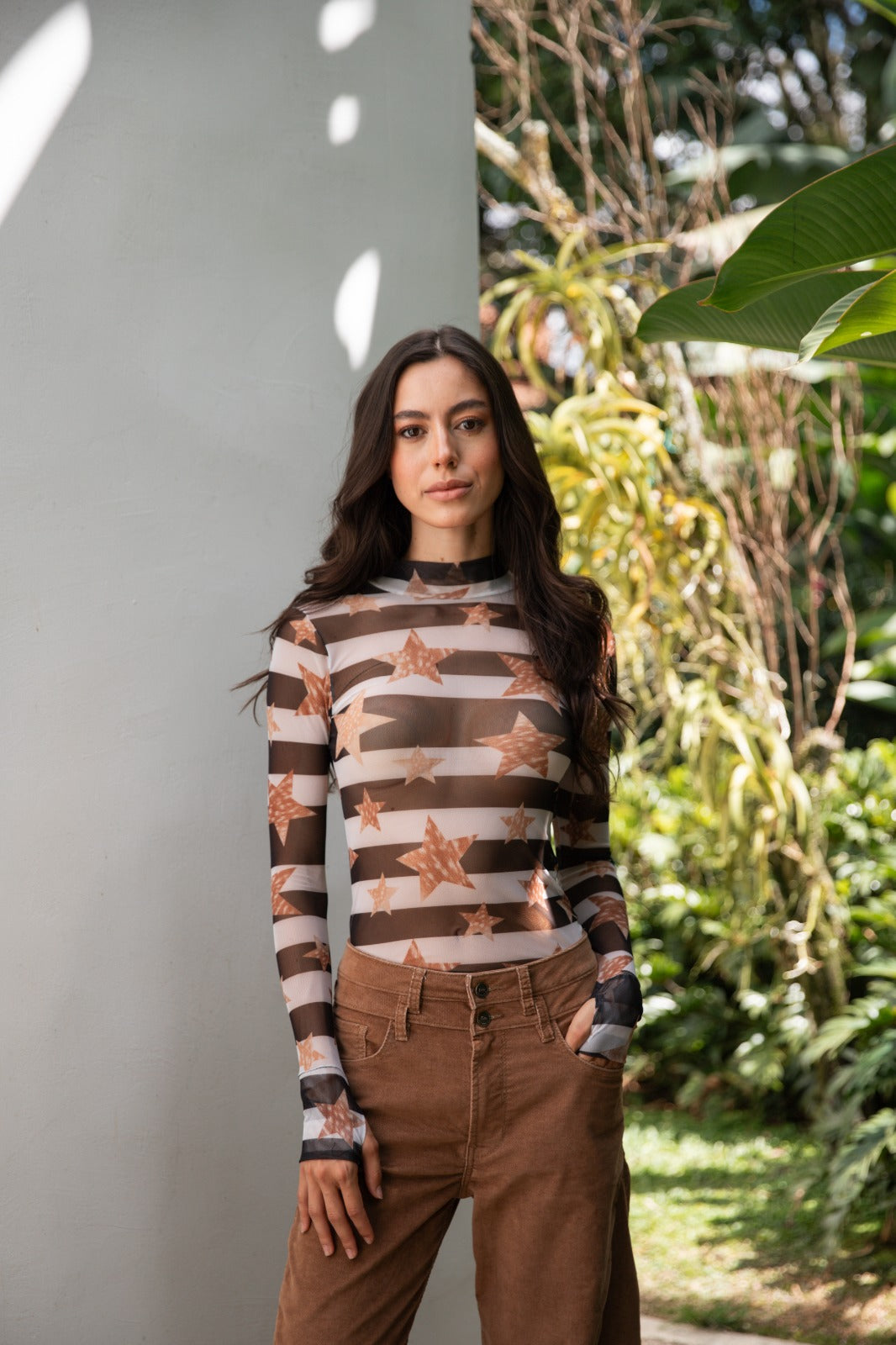 Top de manga larga en mesh elástico con cuello tortuga, tiene aberturas para los pulgares y un fit ceñido ideal para usar solo o en capas