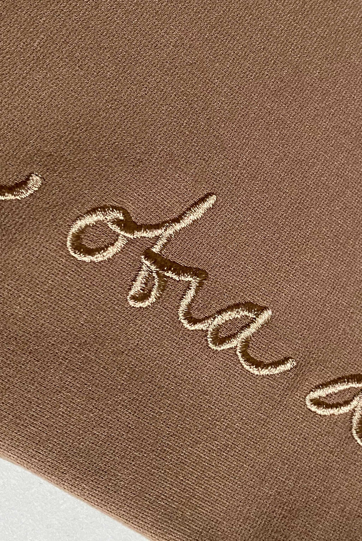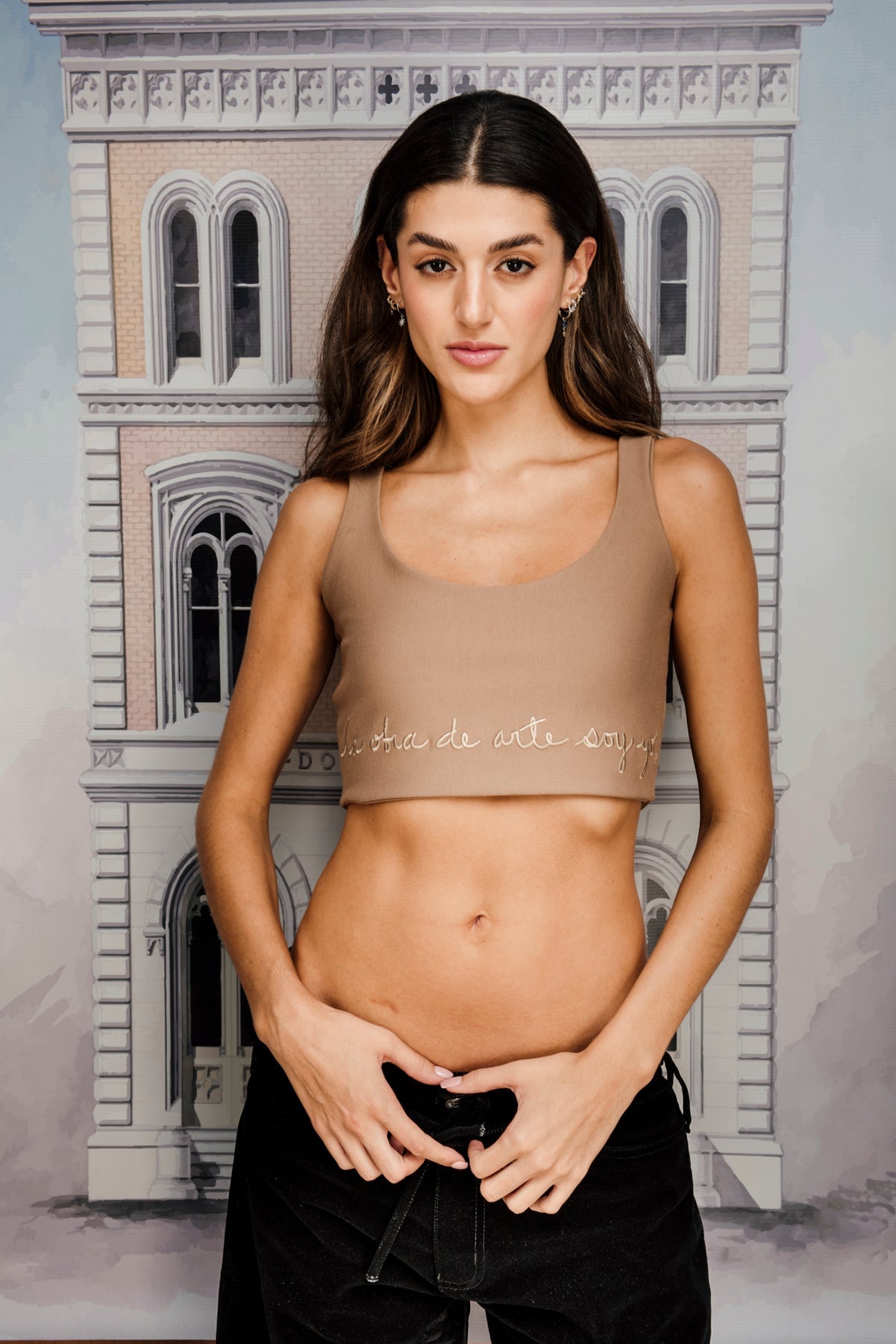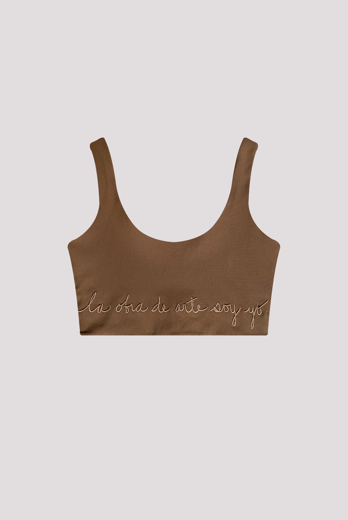 Top clásico color marrón, silueta ajustada en tejido punto de roma 100% poliéster, con bordado en parte inferior