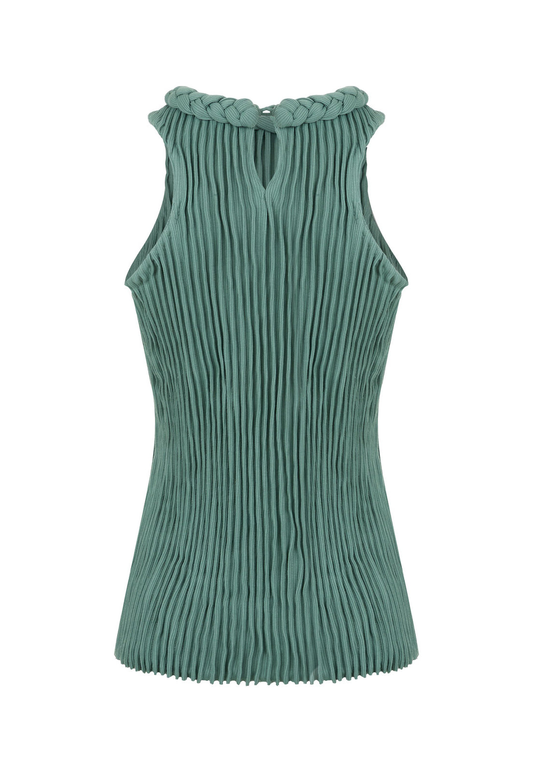 Un tributo a la maestría artesanal y la versatilidad de la colección. Este top en rib de algodón con un alforzado hecho a mano cada 0.5 cm, destaca la precisión de los textiles de MAZ. La trenza, también tejida a mano en rib, simboliza la continuidad y preservación de la sabiduría y la tradición en la cultura latinoamericana. La abertura en forma de gota en la espalda, cerrada con un botón de concha de nácar, añade un acabado distintivo de la marca.