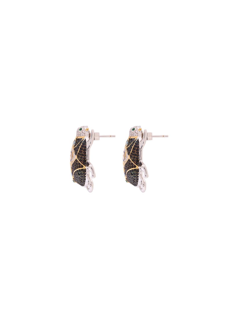 Elaborados en metal bronce con baño de oro de 18 kilates, baño de rodio blanco y negro y delicadas incrustaciones de microcristales y cristales facetados en tonos onyx, cristal, verde menta y zafiro. Técnicas de esmaltado en tono azul claro y oscuro.