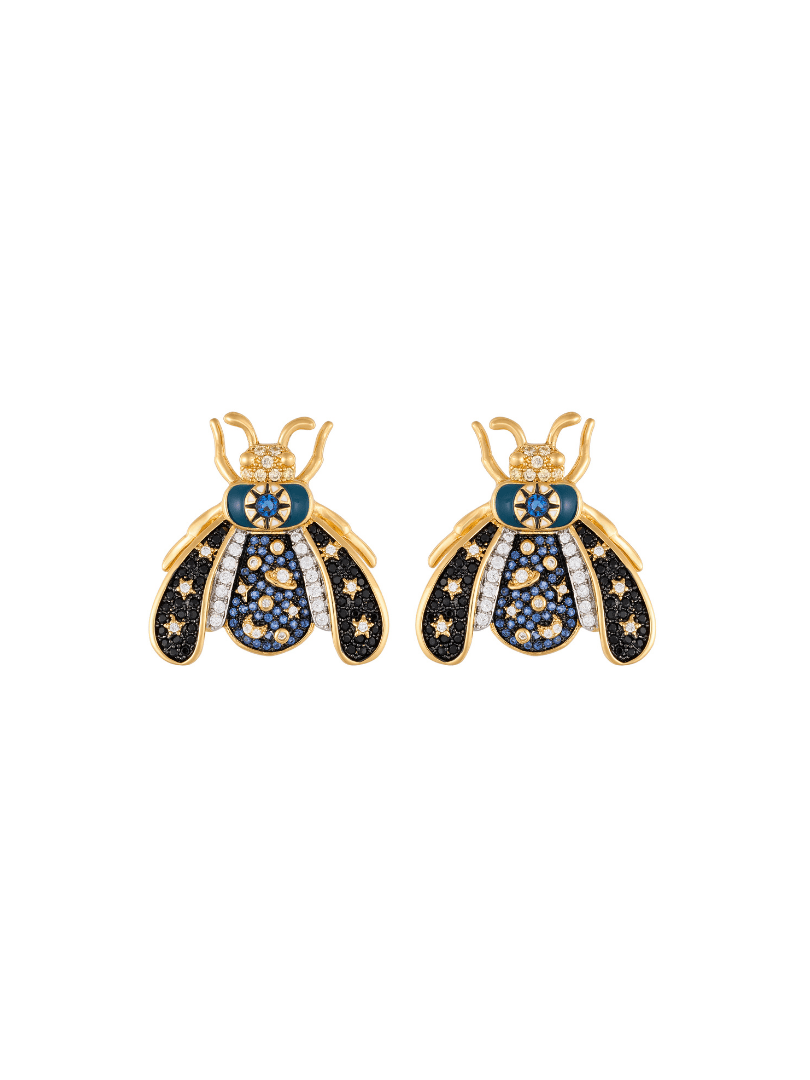 Los Topos Vespa Happi Zafiro evocan la profundidad del cosmos y la vida del río Nilo, una joya que combina elegancia y belleza eterna. Elaborados en metal bronce con un baño de oro de 18 kilates, rodio blanco y rodio negro, enriquecido con deslumbrantes circones en tonos amarillo topacio, zafiro, azul petróleo y onyx. Las técnicas de esmalte en tono azul petróleo, blanco y morado realzan su diseño único, creando un juego de contrastes que cautiva.