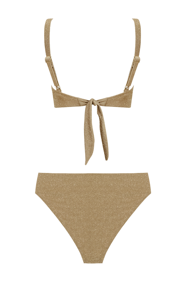 Valeria es un bottom alto a cintura con pierna alta hecho en tela brillante con lurex. Composición de la tela: 77% Poliamida 14% Elastano 9% Lurex.