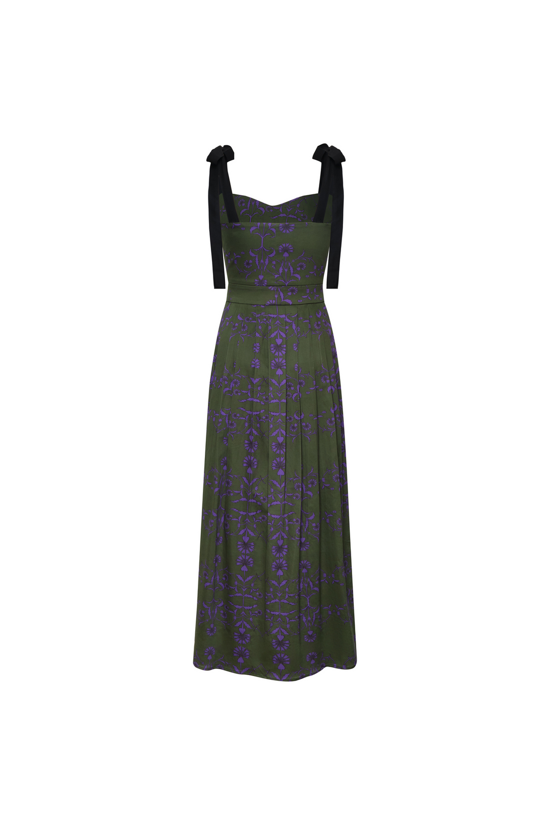 El vestido Cleo combina un romance atemporal con una elegancia moderna. Su corpiño ajustado y falda plisada crean una silueta elegante, mientras que los tirantes anchos de cinta negra añaden un toque de contraste y sofisticación. La base verde oliva intenso está adornada con un intrincado estampado floral morado, lo que lo convierte en una prenda impactante y versátil tanto para eventos de día como de noche.