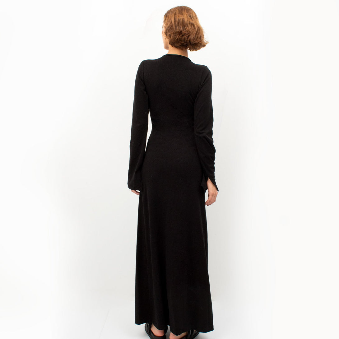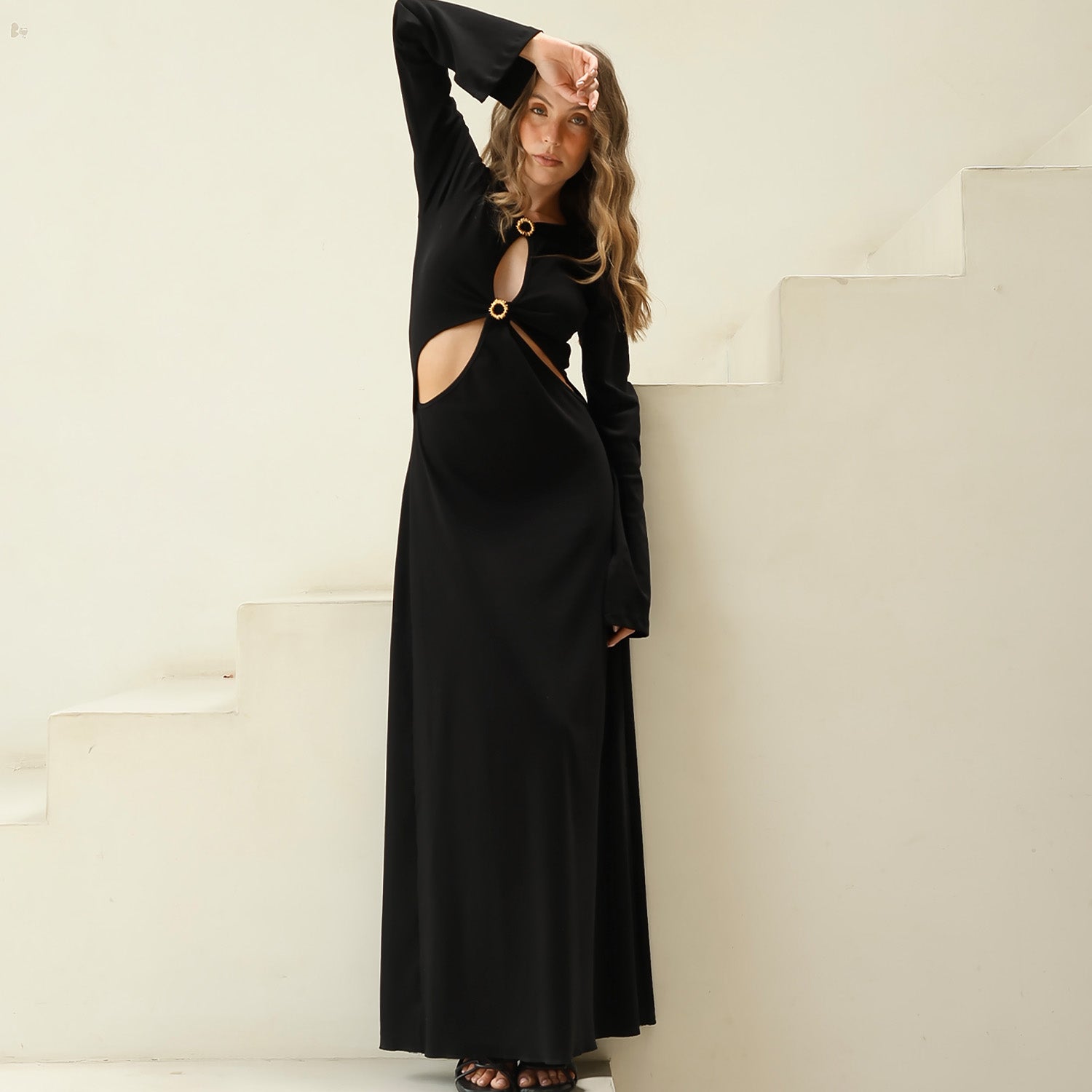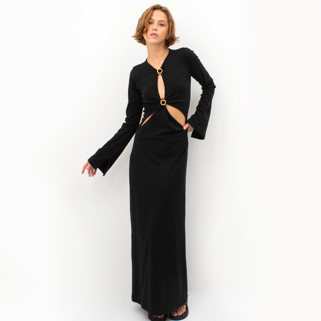 Vestido largo negro con aberturas frontales y detalle de argollas.