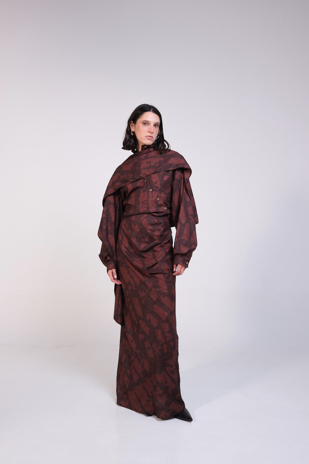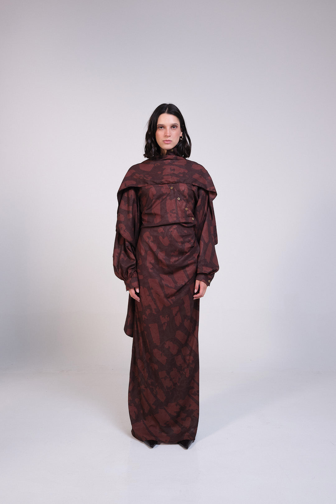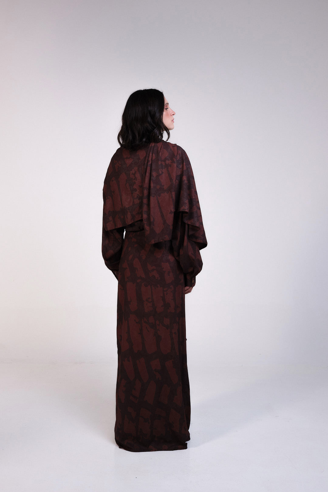 Vestido largo de velo color vino con estampado de rastro de neumático, manga larga con abotonadura diagonal y capa removible.