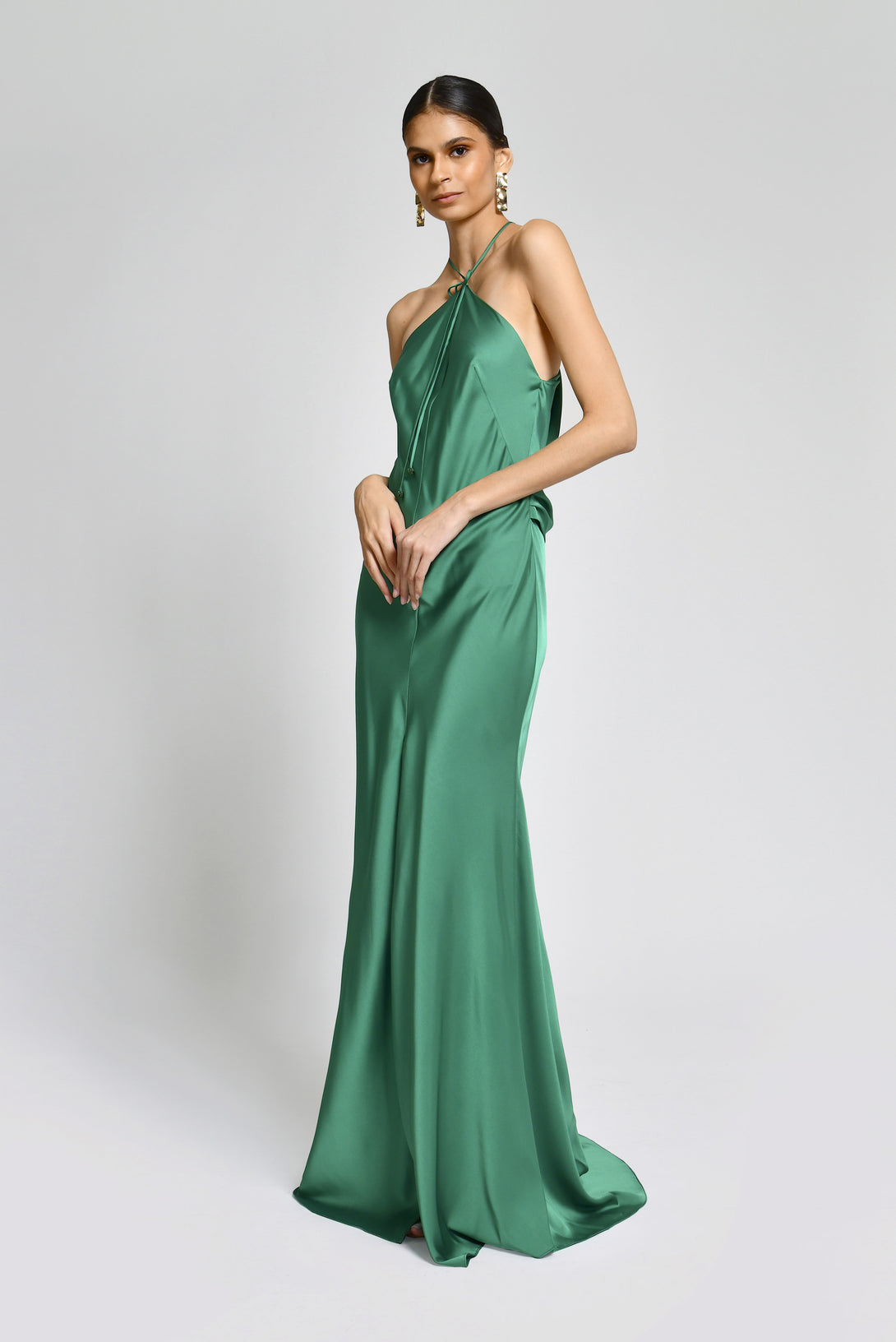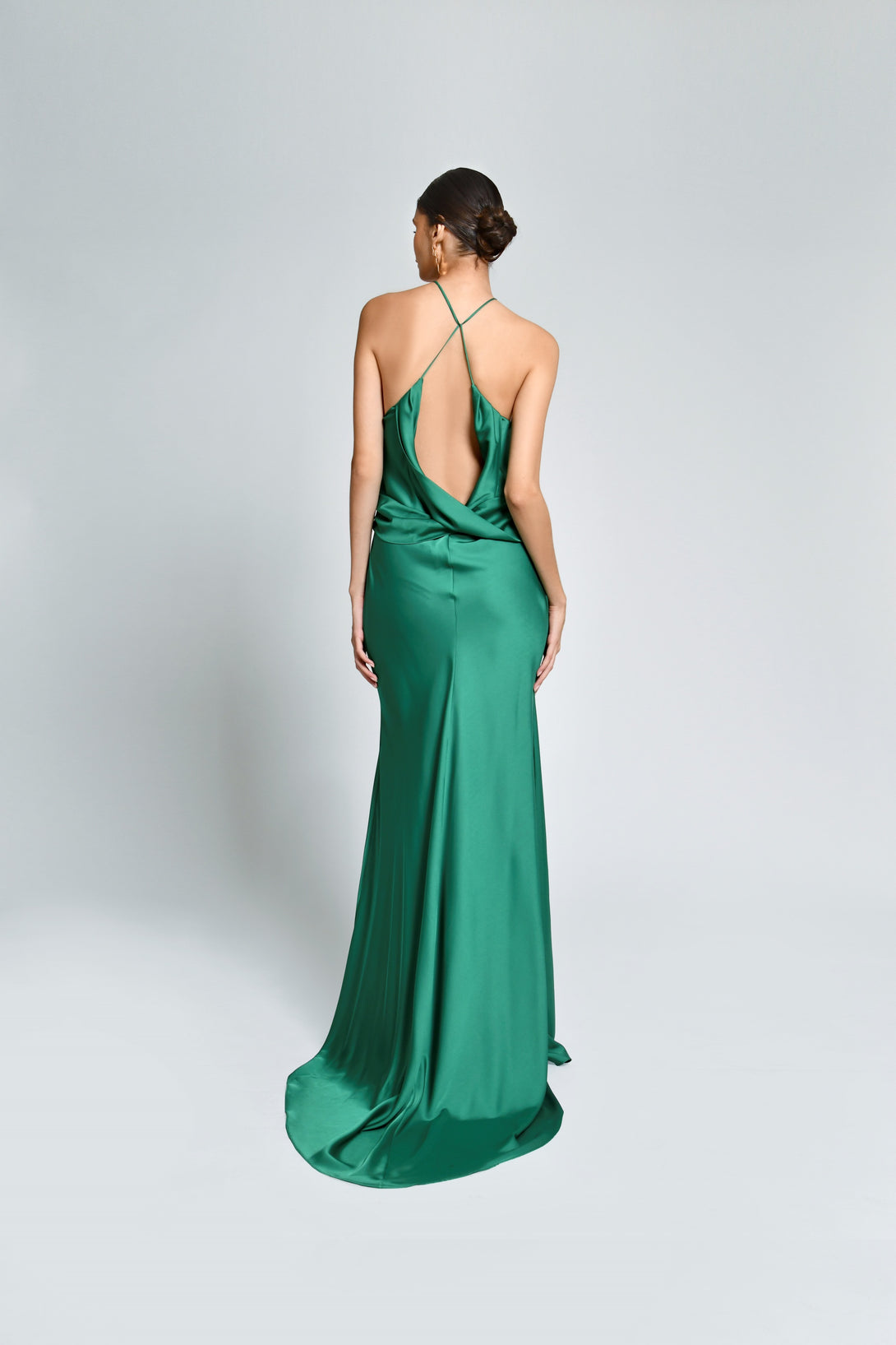 Confeccionado en lujosa seda, nuestro vestido Giselle presenta un cautivador diseño de espalda abierta, acentuado por un delicado detalle de lazo en la parte delantera.