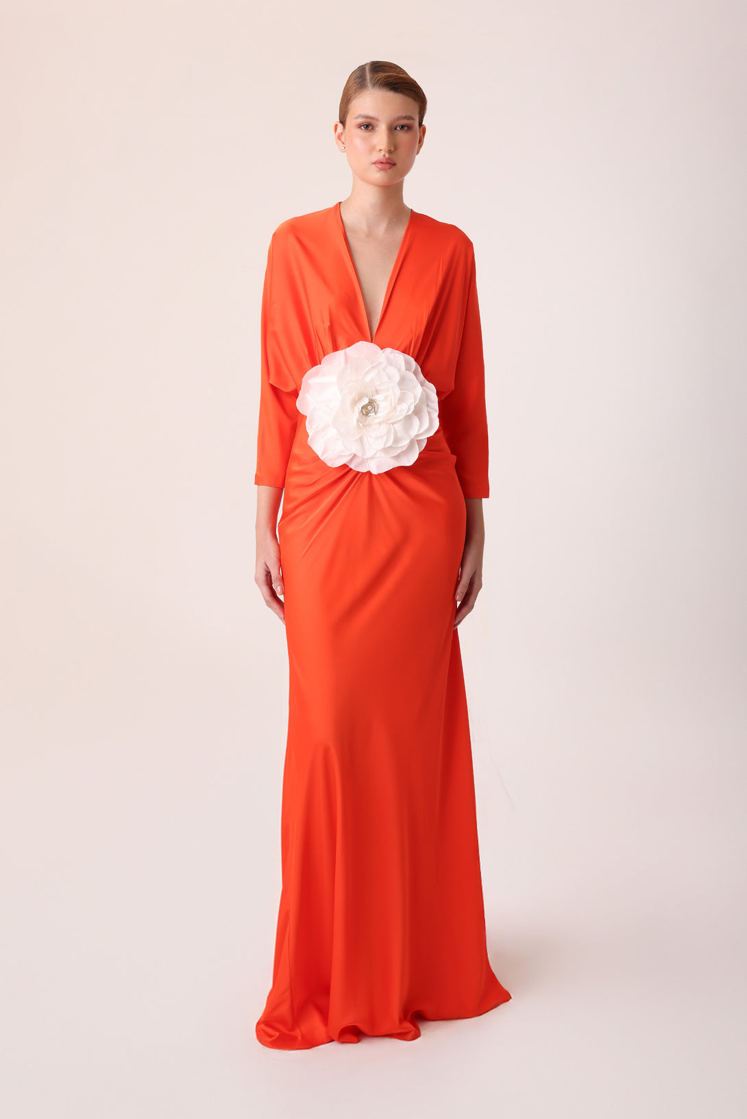 El vestido Heliconia es un llamativo vestido confeccionado en seda, con una llamativa maxiflor que adorna la cintura. Su profundo escote en V en la parte delantera añade un toque de sensualidad, mientras que las mangas largas aportan una elegancia atemporal al look.