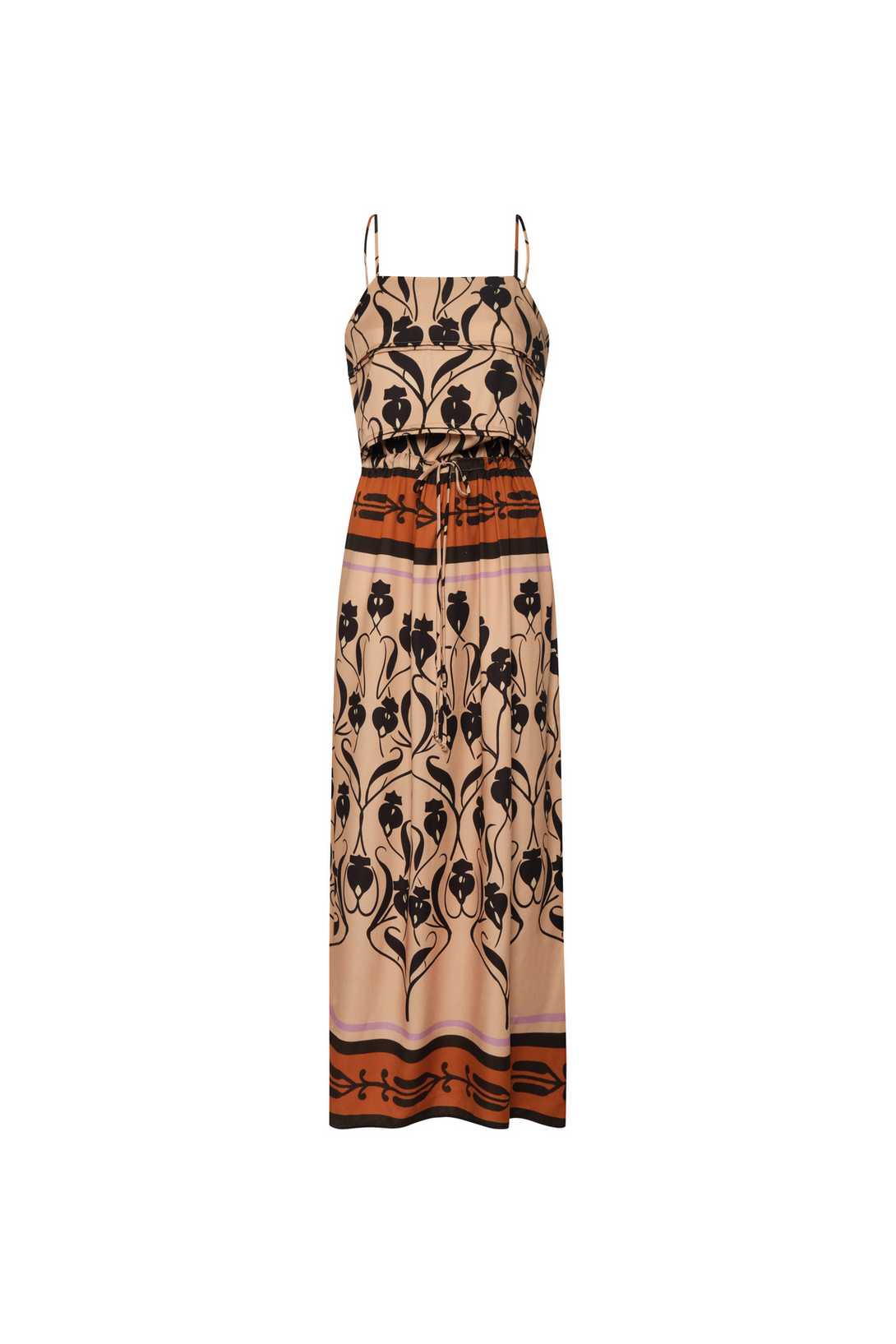 Inspirado en los paisajes cálidos y el movimiento del viento sobre la arena, el vestido Indómita celebra la feminidad libre y natural. Su silueta relajada y fluida cae con gracia, ajustándose en la cintura con un delicado lazo que permite personalizar el calce. Los tirantes finos y el estampado orgánico en tonos tierra evocan la esencia boho de ELSA, ideal para acompañarte en días de calma o travesías llenas de sol.
