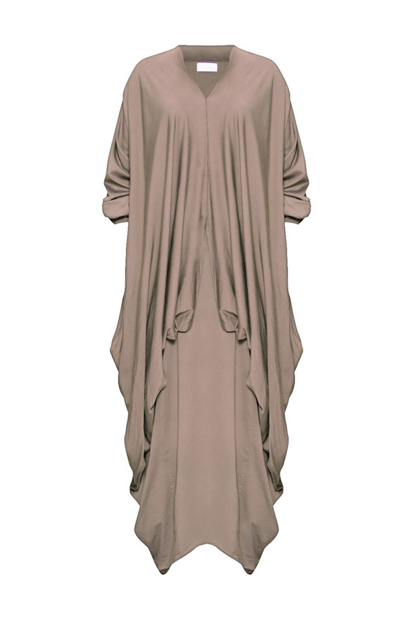 Vestido color beige, son dos piezas en uno (inferior + superior). Escote en pico y manga larga con resorte en puños. Bolsillos delanteros. Largo con corte asimétrico.