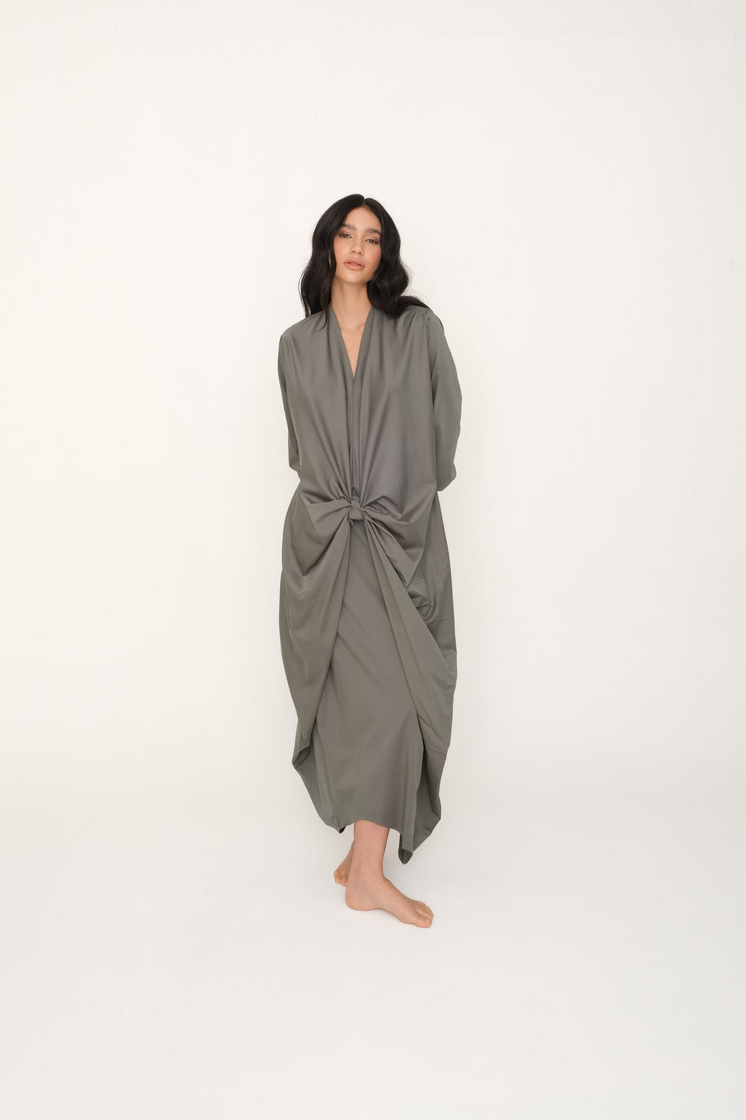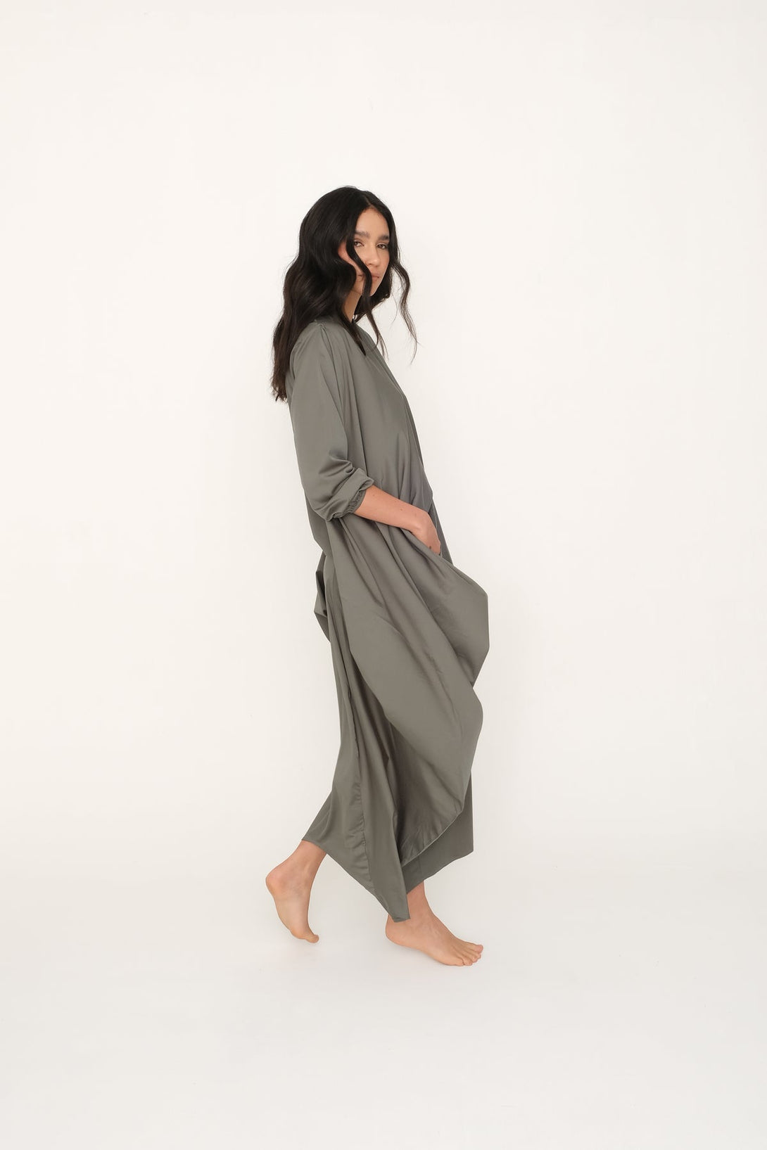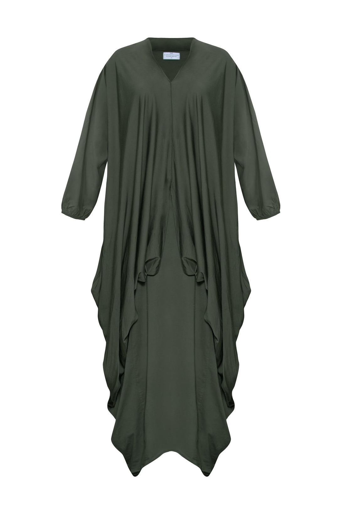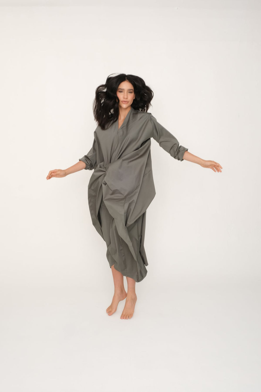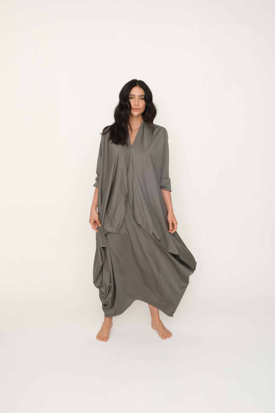 Vestido color verde aguamarina, son dos piezas en uno (inferior + superior). Escote en pico y manga larga con resorte en puños. Bolsillos delanteros. Largo con corte asimétrico. Puedes usarlo suelto, anudado, con un cinturón. Hecho en Colombia.