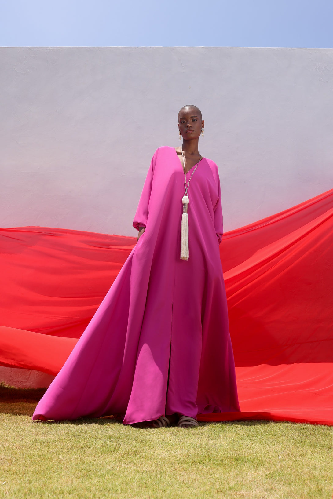 El vestido Torcaza combina a la perfección elegancia y comodidad gracias a su silueta amplia y fluida. Su corte relajado y sofisticado lo hace chic y fácil de llevar. El vestido incluye un collar llamativo que le da el toque final perfecto.